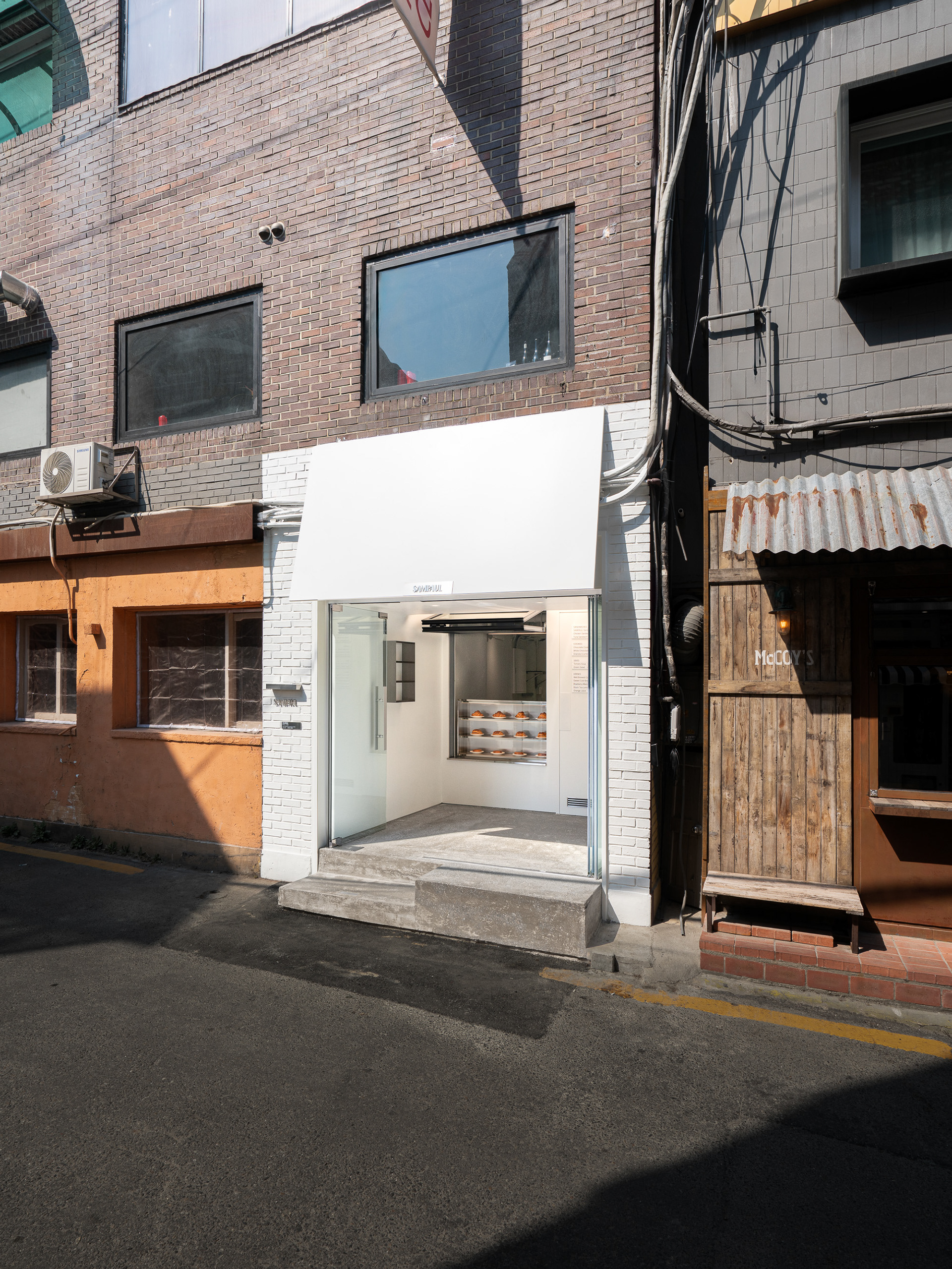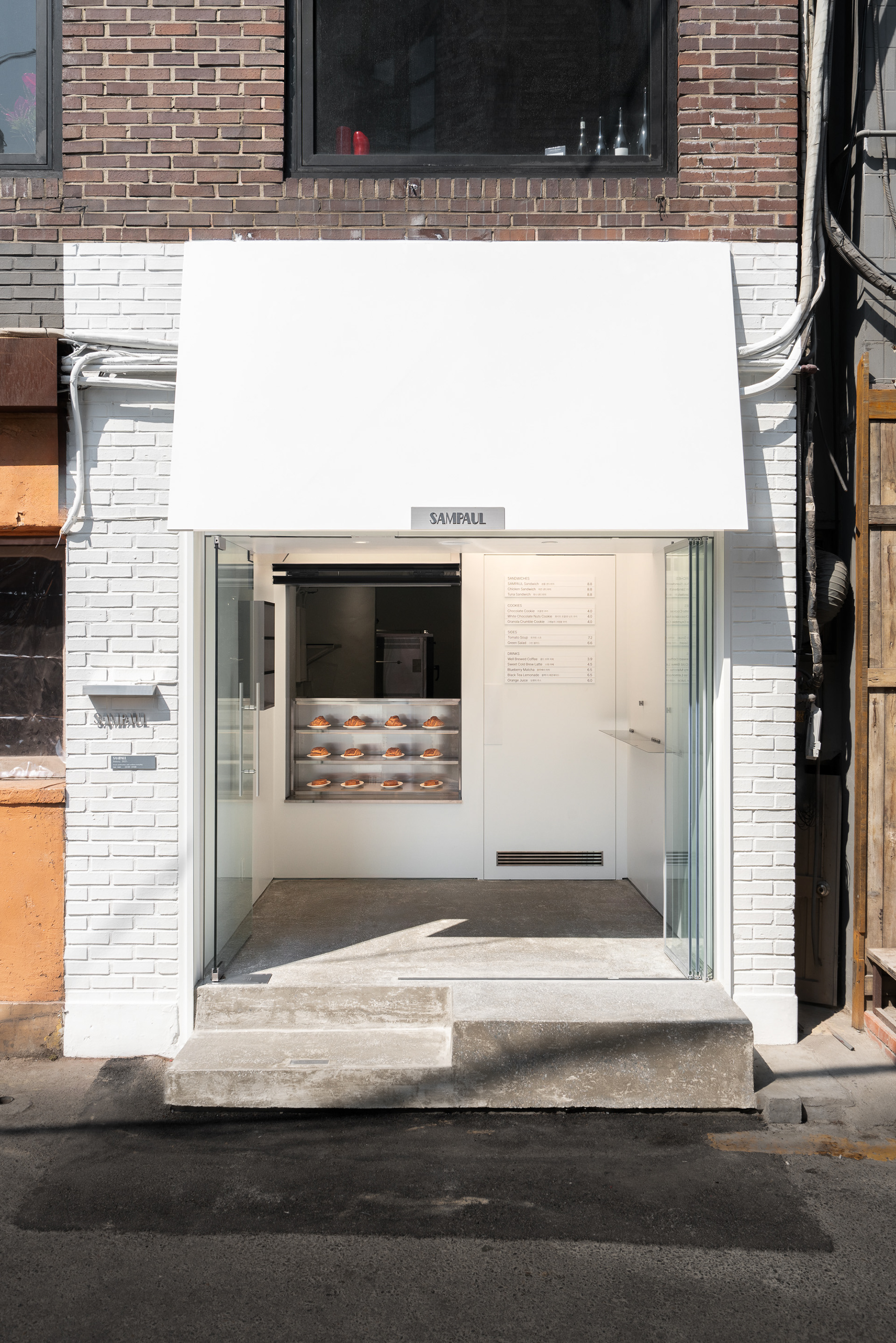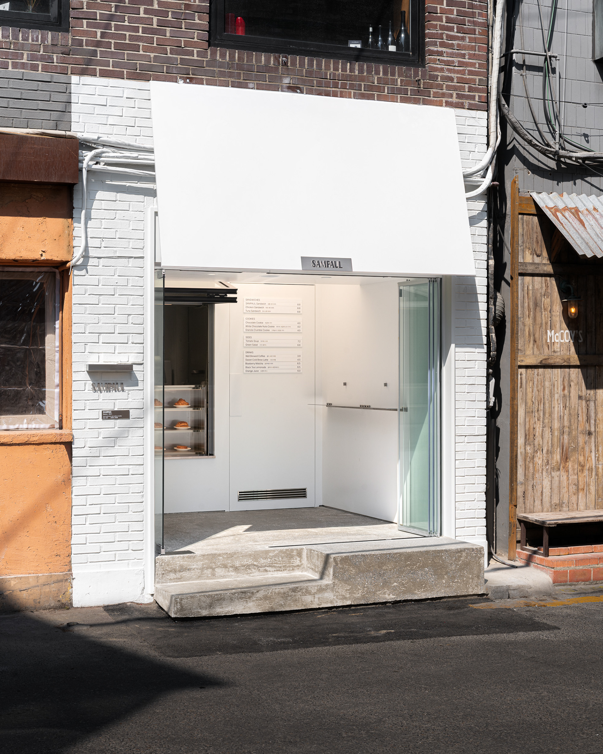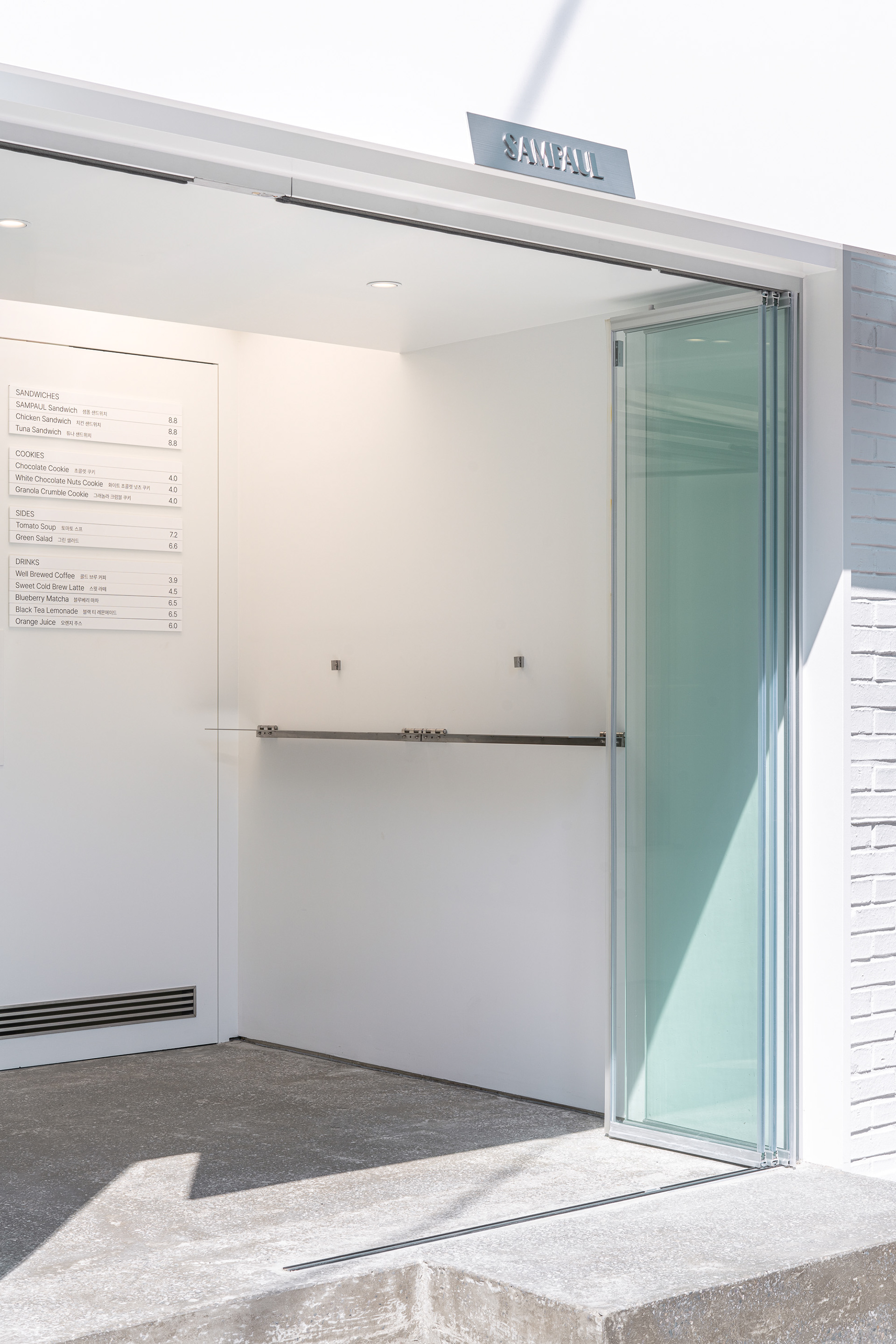 폴딩도어와 폴드업 창은 이 공간의 확장성을 만드는 장치다. 문을 열면 내부와 외부의 경계가 느슨해지고, 가게는 하나의 실내라기보다 골목의 흐름에 자연스럽게 스며드는 장면처럼 바뀐다. 샘폴은 이 작은 흰 틈 안에서, 사람들이 잠시 머물다 다시 골목으로 번져 나가는 공간이기를 바랐다.
