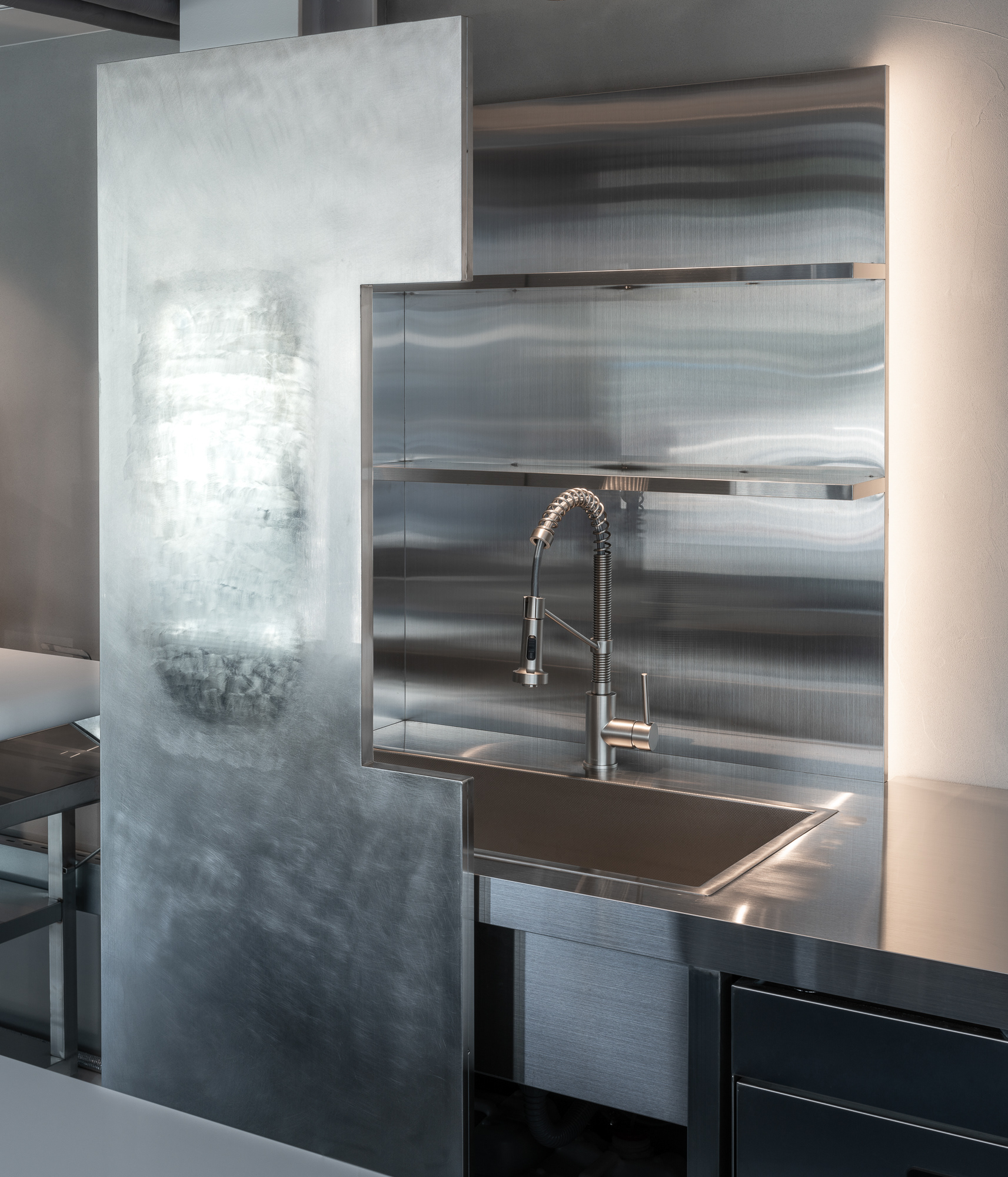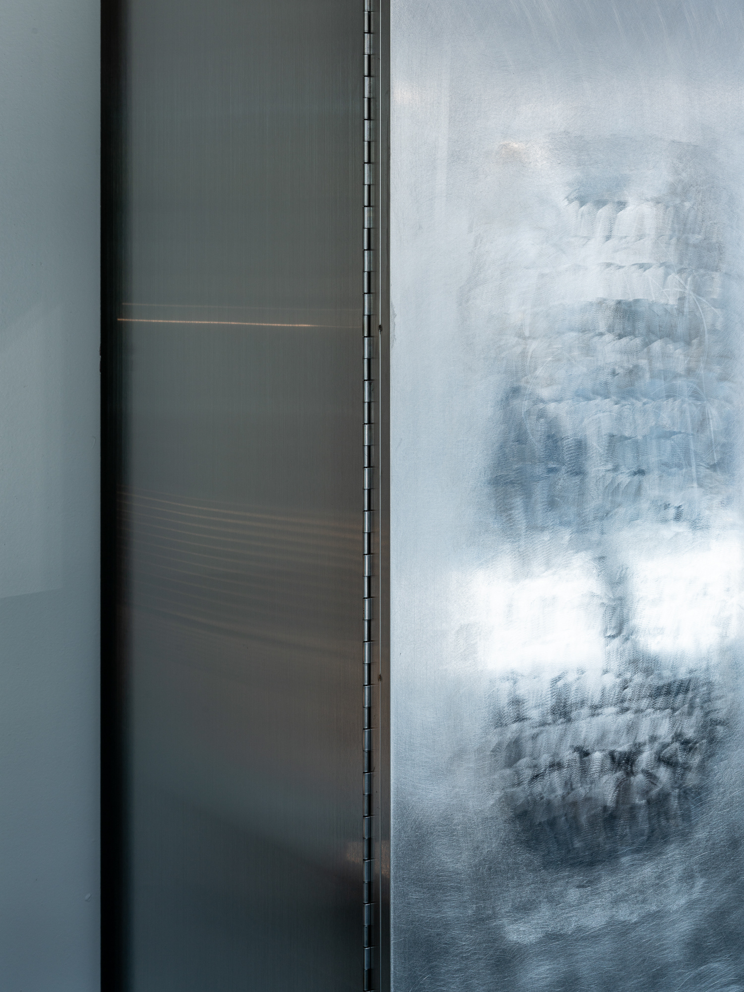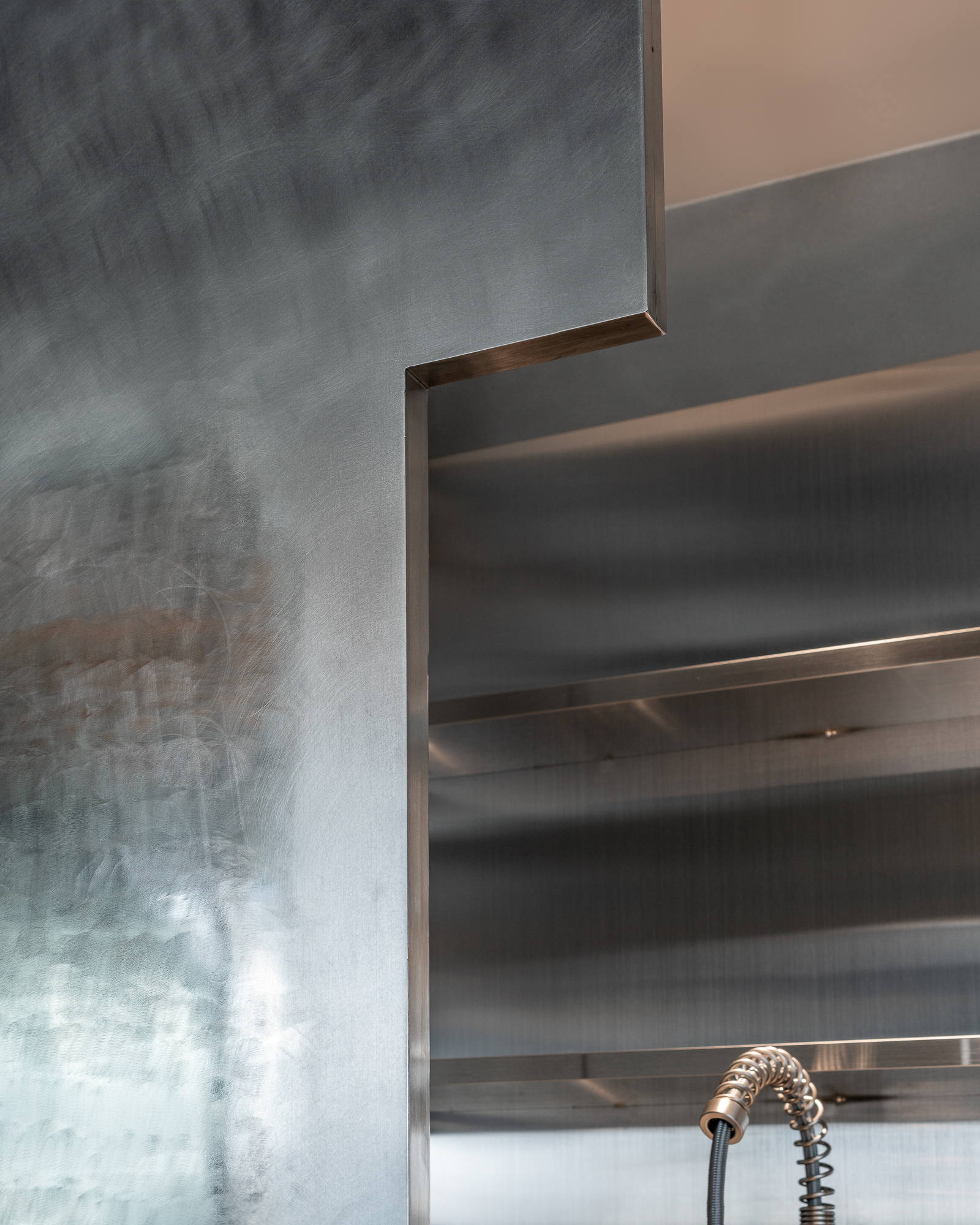 바 테이블 뒤 금속 도어에는 금속 표면을 여러 번 문질러 광택과 농도를 조절하는 이른바 ‘빠우’ 마감을 적용했다. 촛불을 후- 불었을 때 퍼지는 원형의 흐림을 표현하기 위해, 표면에 부드러운 그라데이션이 남도록 직접 작업했다. 아후라는 이름의 감각을 가장 직접적으로 담고 있는 디테일이다. 이 공간은 작은 규모 안에서 기능과 사물을 또렷한 이미지로 바꾸며, 발랄함과 조형성을 함께 남기는 쪽에 가깝다.