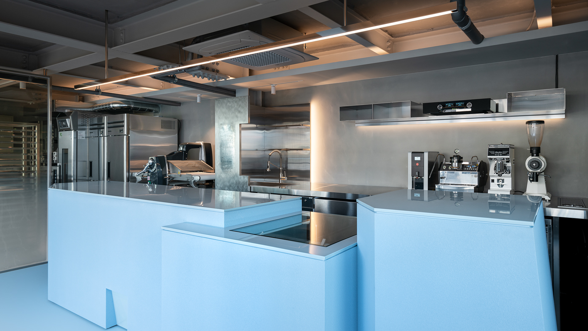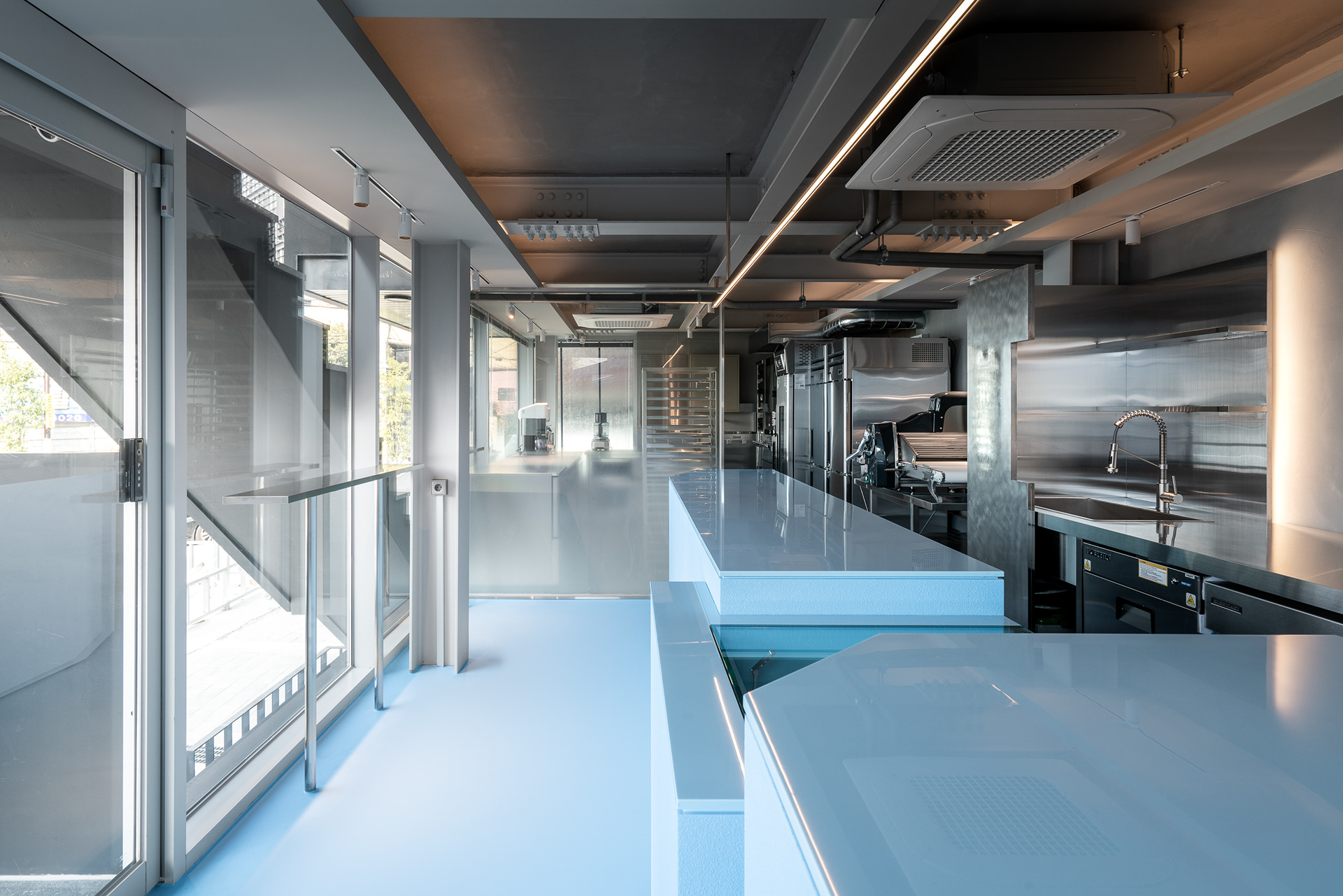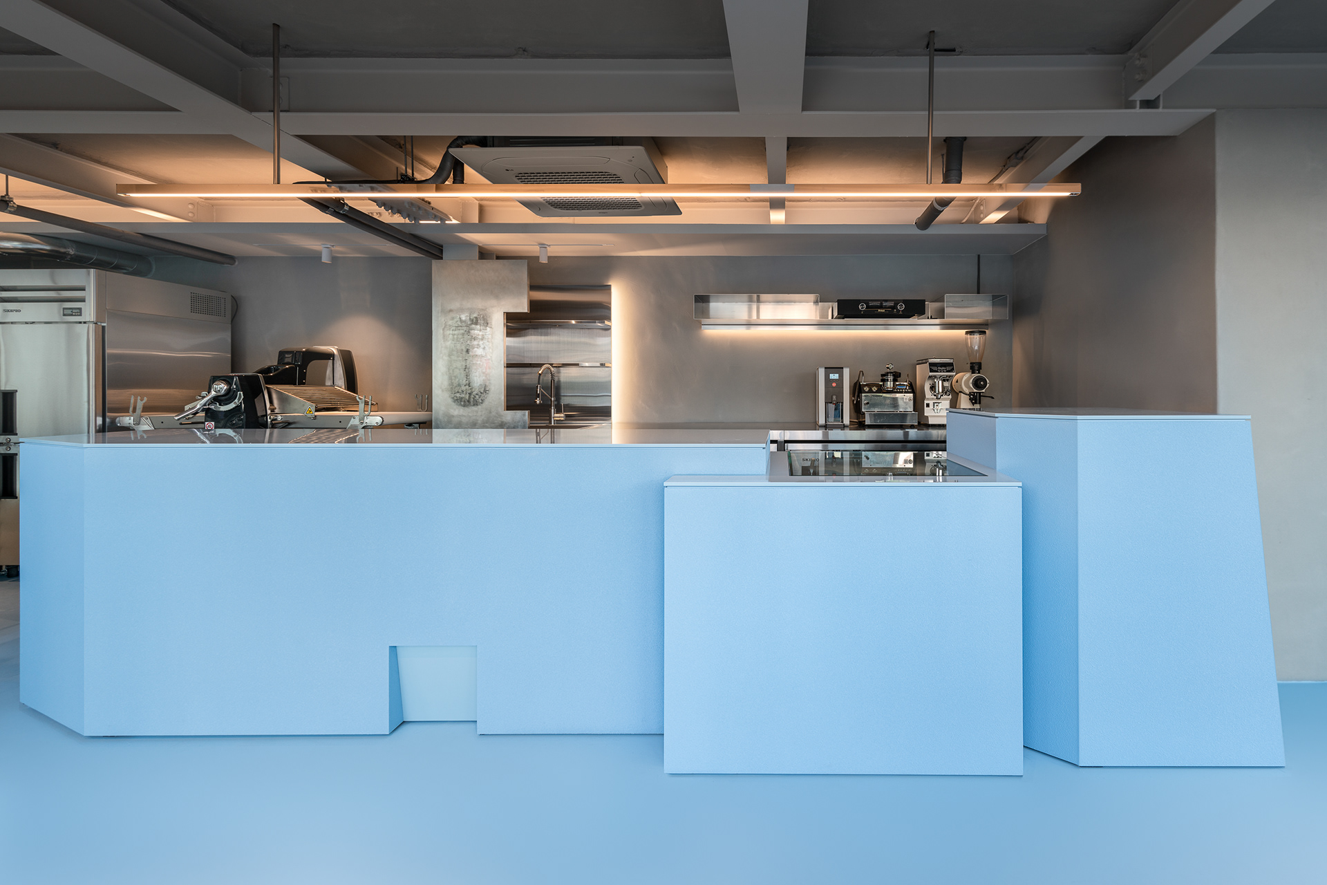 바 테이블은 아이가 막 잘라낸 생일 케이크처럼 삐뚤고 사선으로 끊긴 덩어리에서 출발했다. 각기 다른 높이는 카운터와 픽업, 리턴, 디스플레이, 냉장 테이블의 기능을 나누고, 브랜드의 하늘색과 조색한 스터코 텍스처가 아후의 이미지를 만든다. 바 뒤의 커피 키친과 금속 집기, 매킨토시 스피커 역시 설비가 아니라 하나의 장면처럼 보이도록 구성했다.