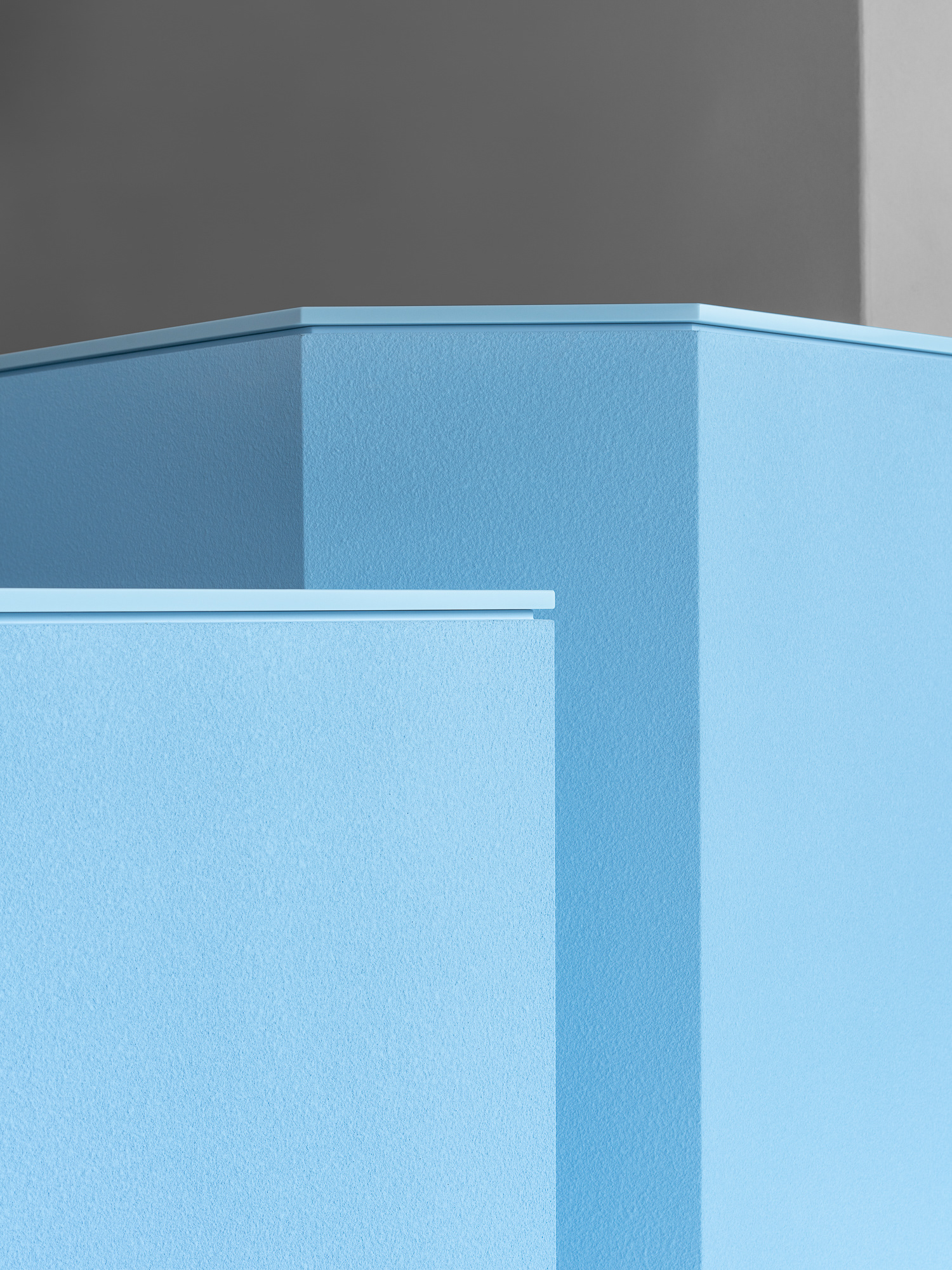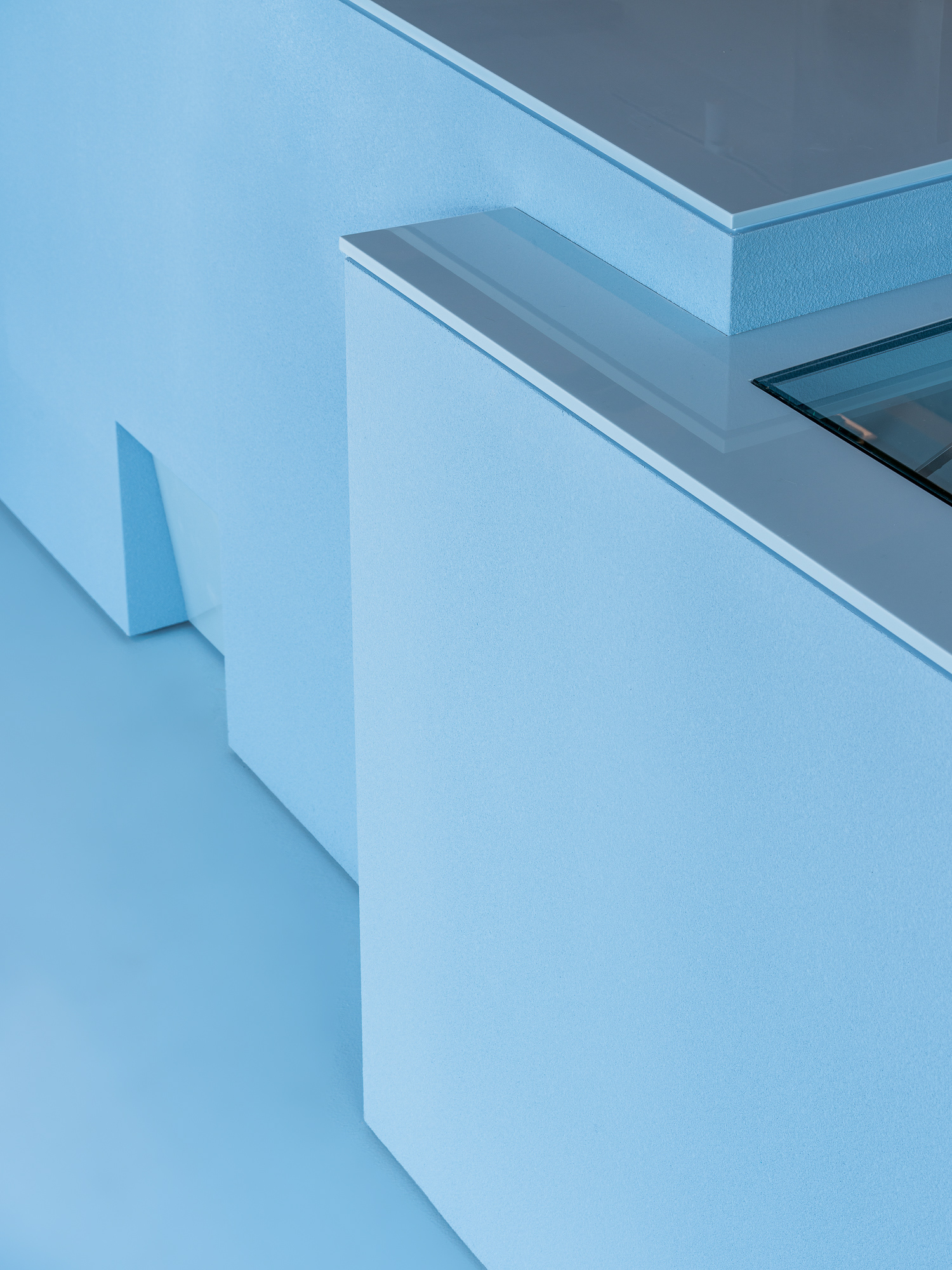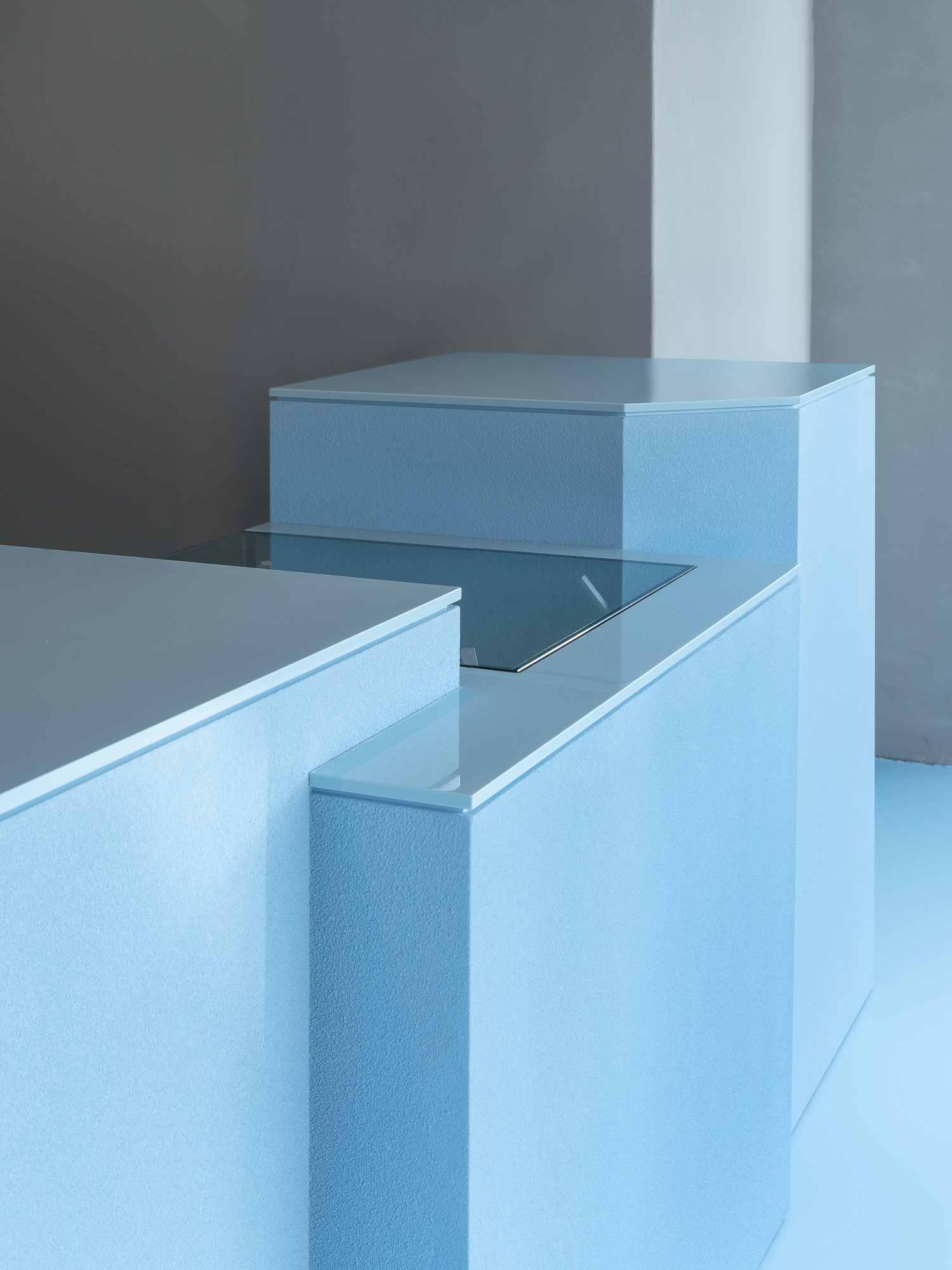 바 테이블은 아이가 막 잘라낸 생일 케이크처럼 삐뚤고 사선으로 끊긴 덩어리에서 출발했다. 각기 다른 높이는 카운터와 픽업, 리턴, 디스플레이, 냉장 테이블의 기능을 나누고, 브랜드의 하늘색과 조색한 스터코 텍스처가 아후의 이미지를 만든다. 바 뒤의 커피 키친과 금속 집기, 매킨토시 스피커 역시 설비가 아니라 하나의 장면처럼 보이도록 구성했다.