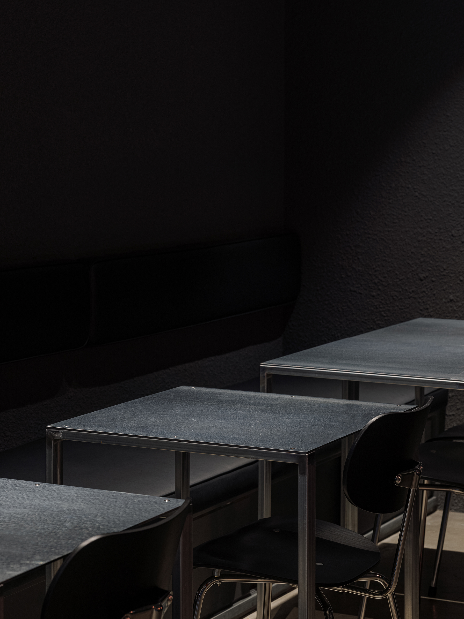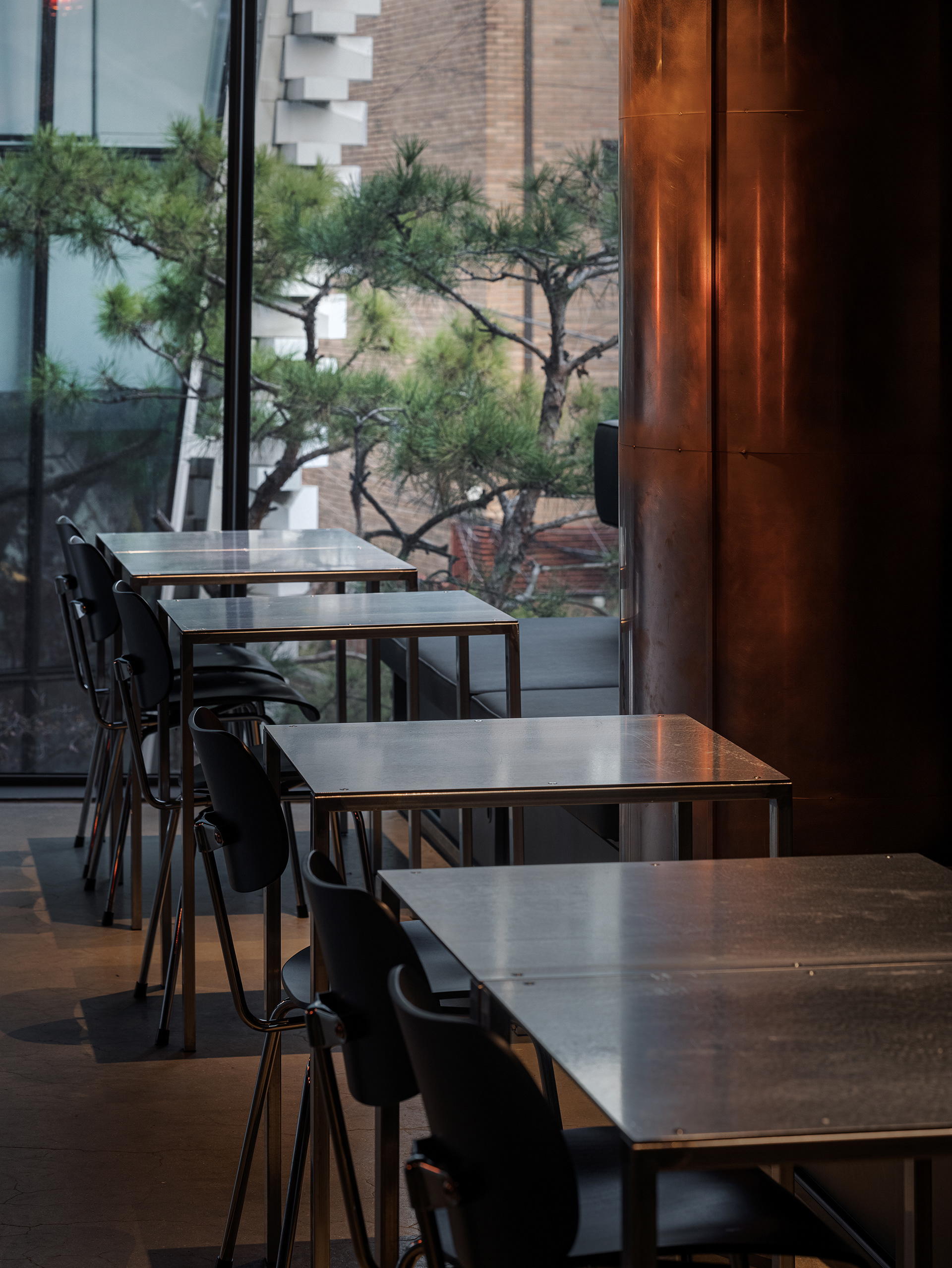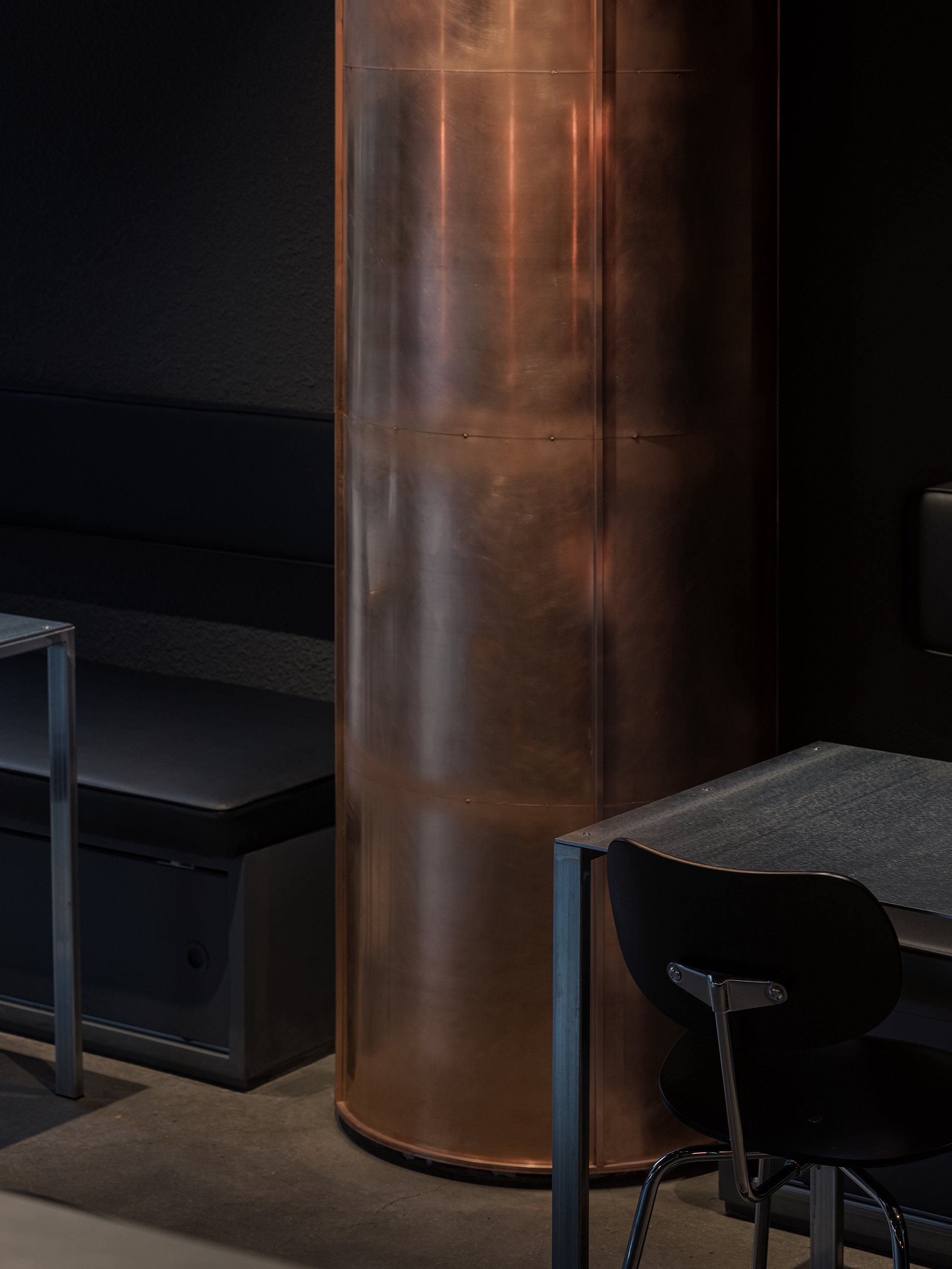 공간의 분위기는 치킨버거가 가진 성격에서 출발했다. 러프하고, 스모키하고, 스파이시한 인상을 재료로 옮기고자 했다. 진한 회색의 거친 도장, 푸른 기가 도는 아연과 스틸, 구릿빛의 적동, 산화된 구로철은 어두운 공간 안에서 거칠고 뜨거운 질감을 만든다. 정제된 매끈함보다는, 재료가 가진 표정과 밀도를 그대로 드러내는 쪽에 가깝다.