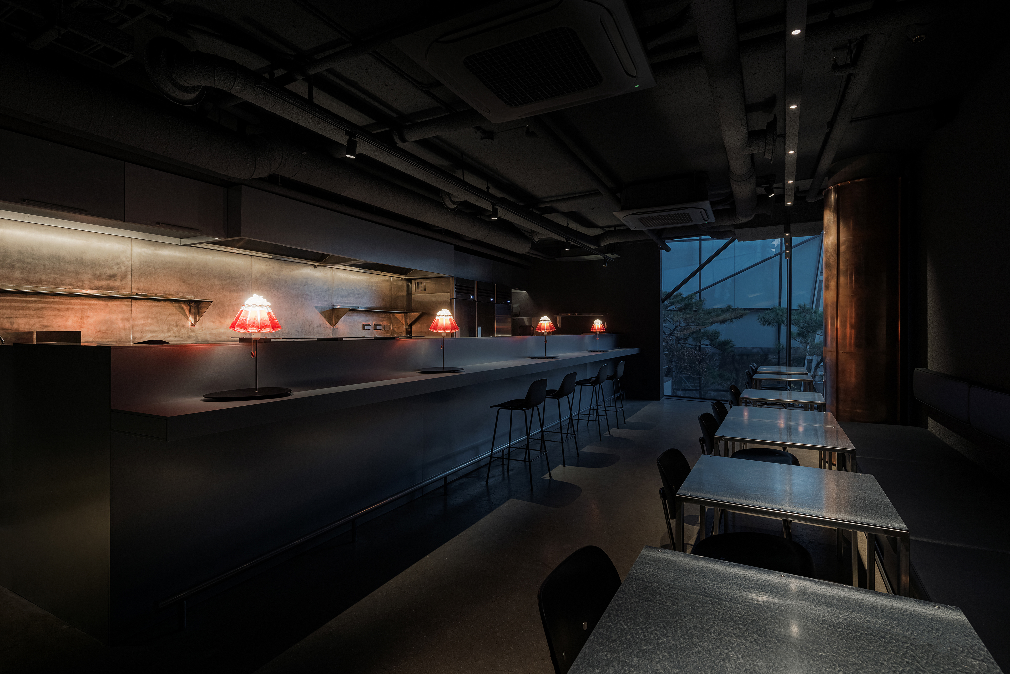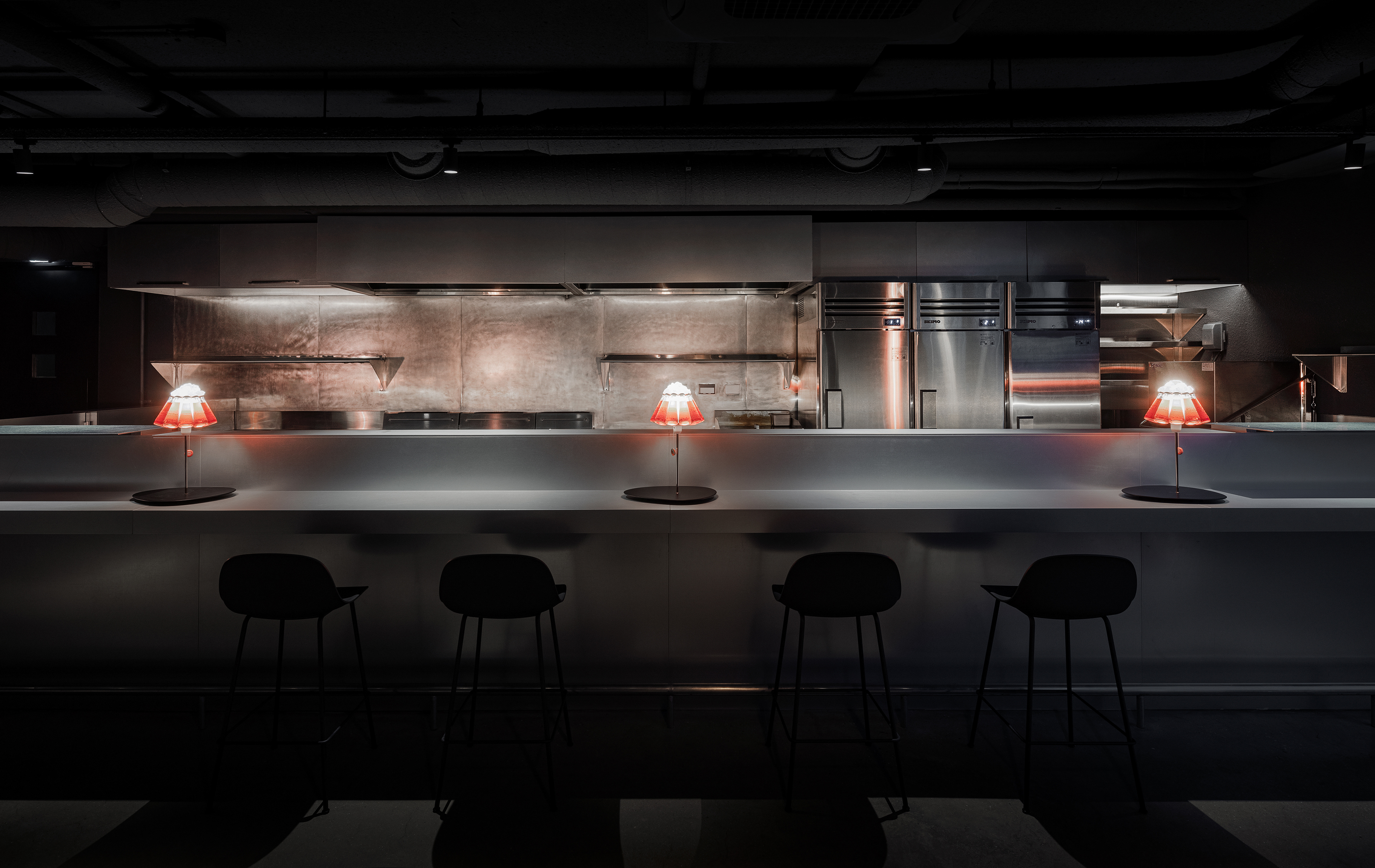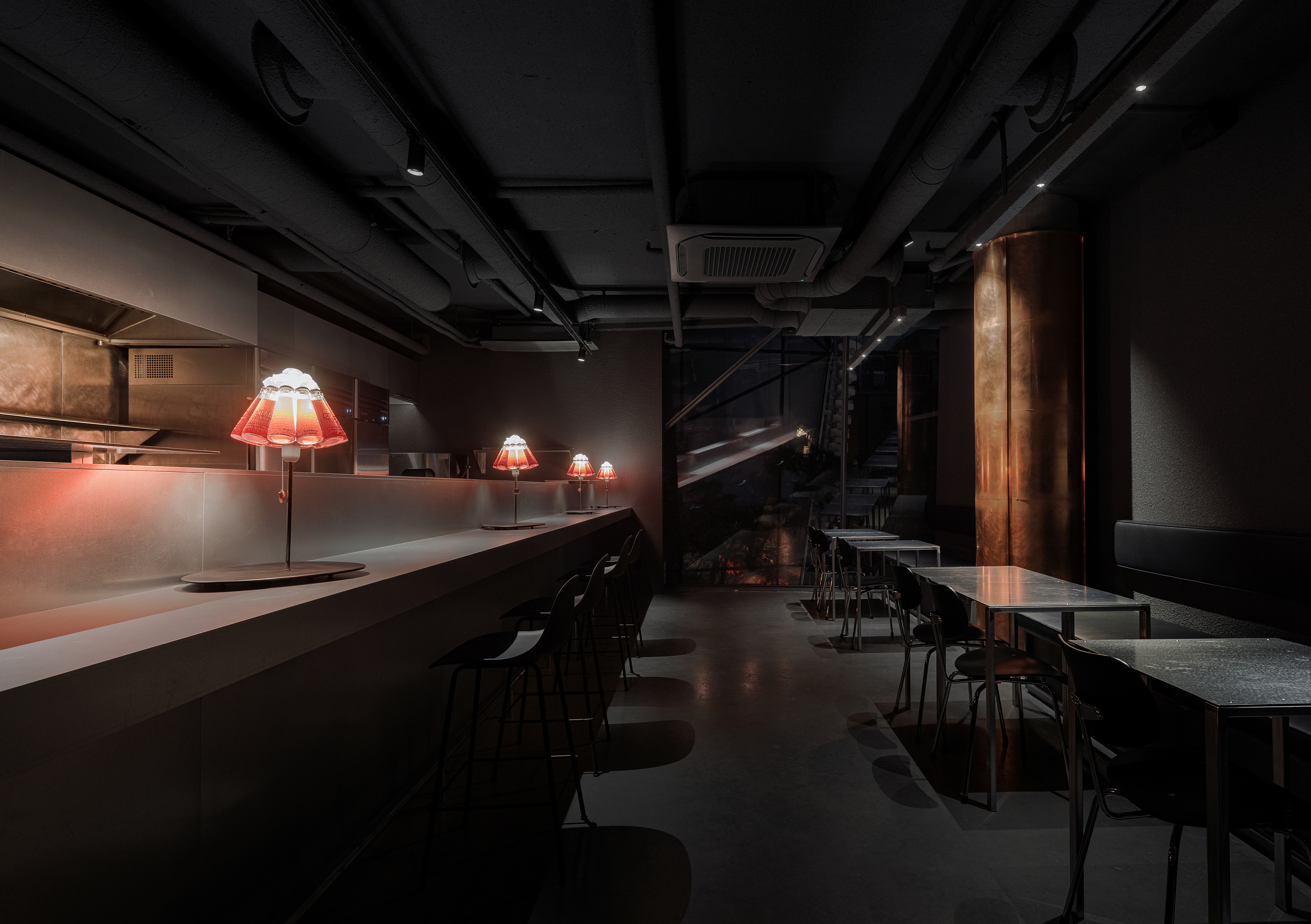 중앙의 바 테이블은 투박한 형태와 매끈한 아연 스틸의 대비를 통해 시선을 끌고, 셰프의 움직임과 조리의 리듬이 가장 또렷하게 드러나는 장면을 만든다. 조명은 공간의 분위기를 조금 비틀어주는 장치다. 자칫 무겁고 고압적으로 흐를 수 있는 재료와 톤 사이에서, 테이블 위의 잉고 마우러 캄파리 조명은 위트 있는 균형을 만든다. 붉은 병이 그대로 조명이 되는 디자인은 가볍게 장난스럽고, 어두운 공간 안에서 선명한 포인트가 된다. 덕분에 CKBG.LAB은 거칠고 강한 인상을 유지하면서도, 한쪽으로만 치우치지 않는 리듬을 갖게 된다.