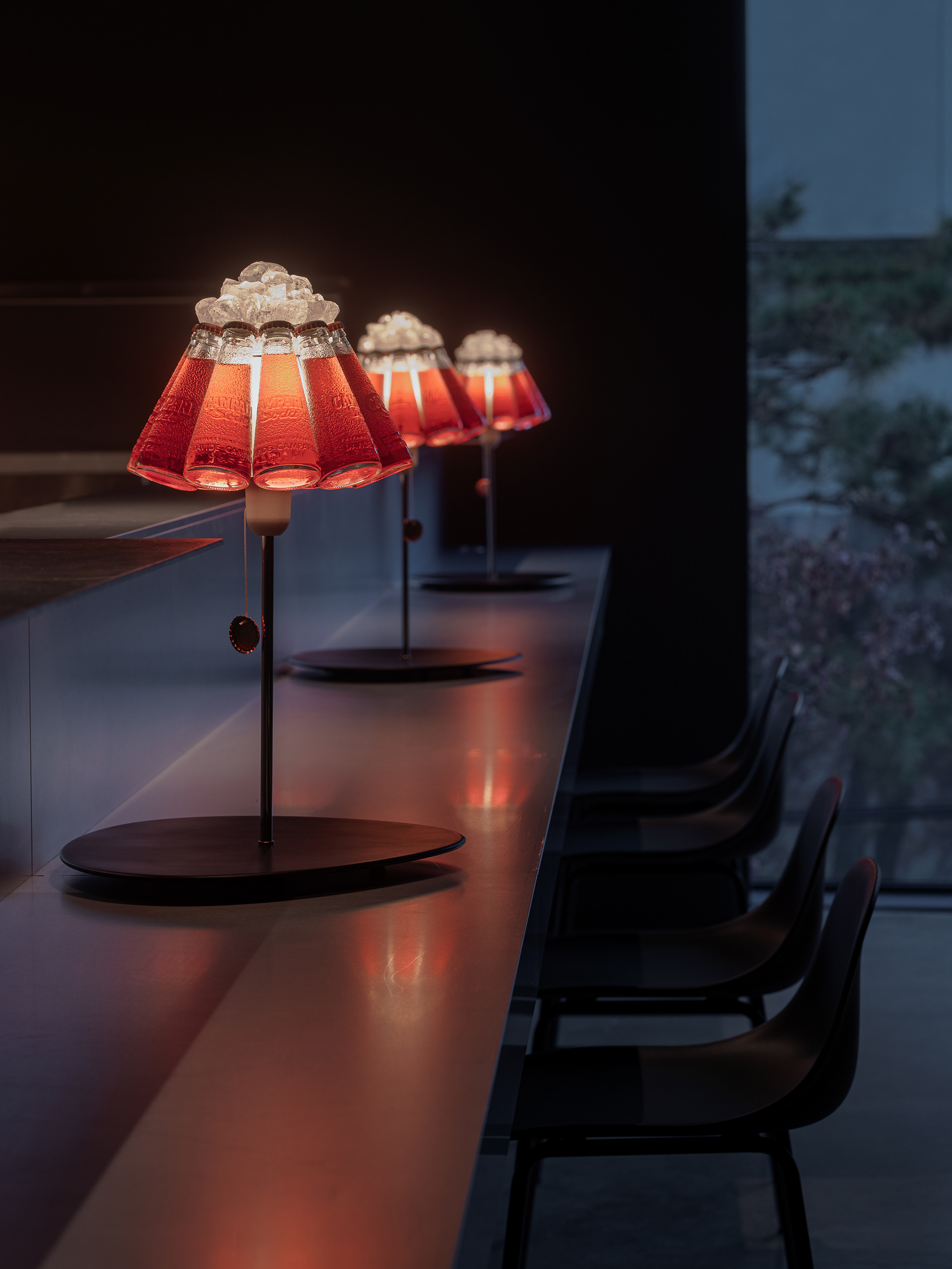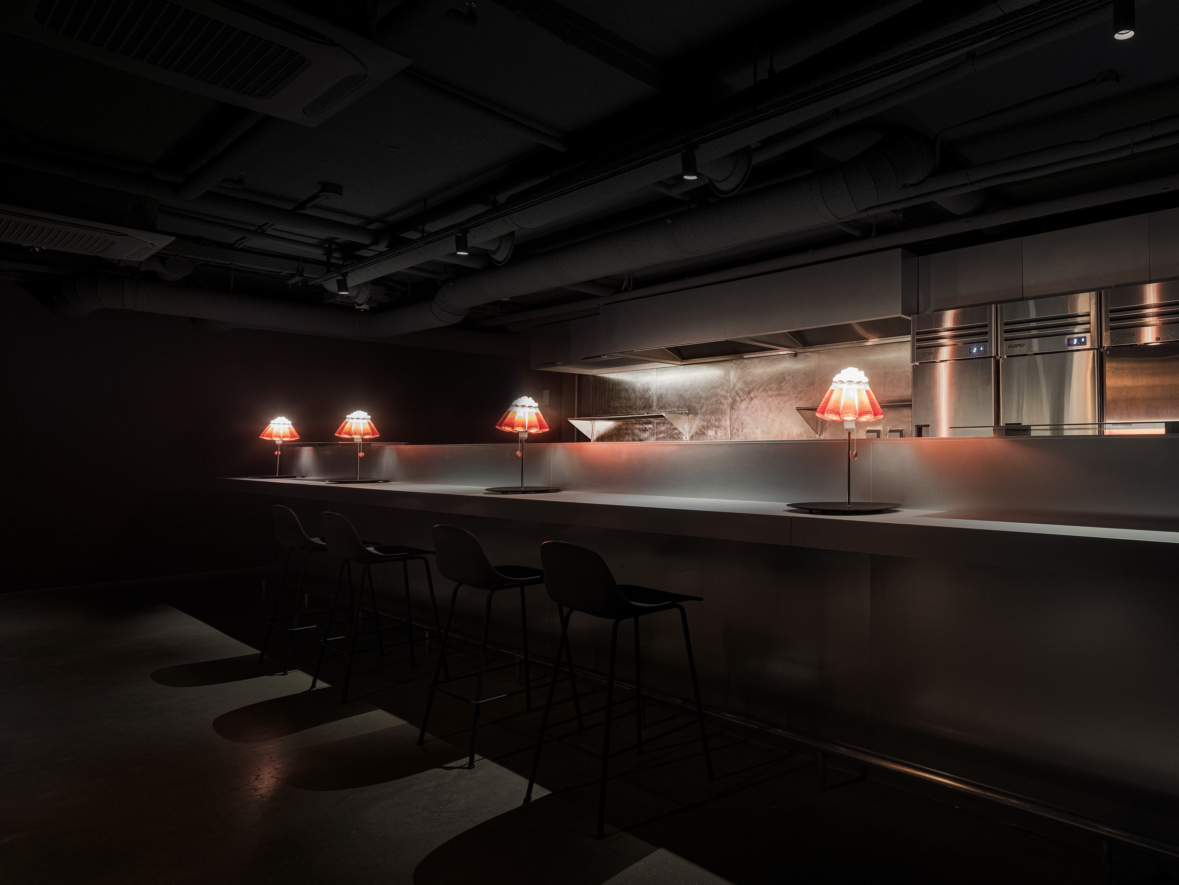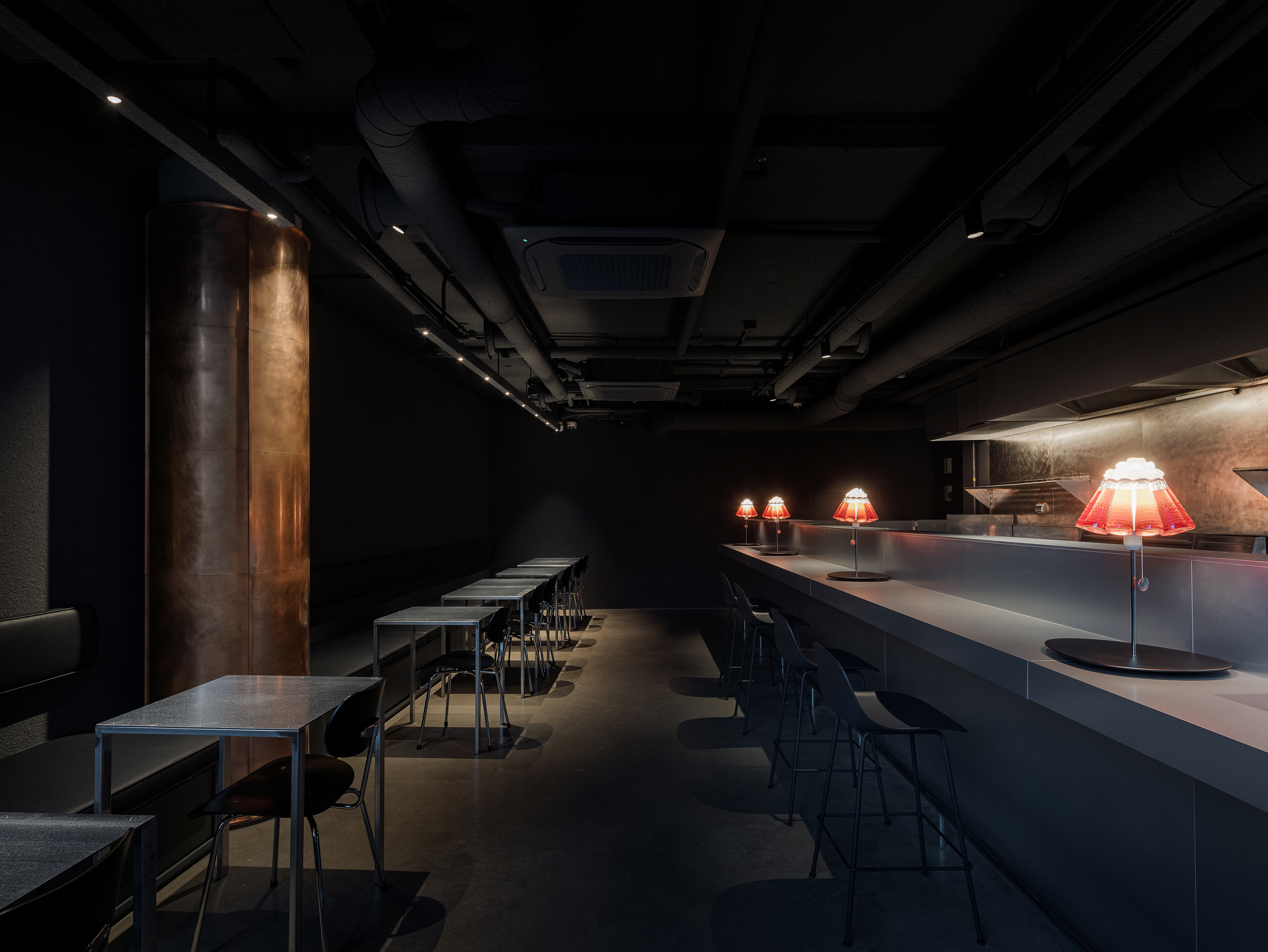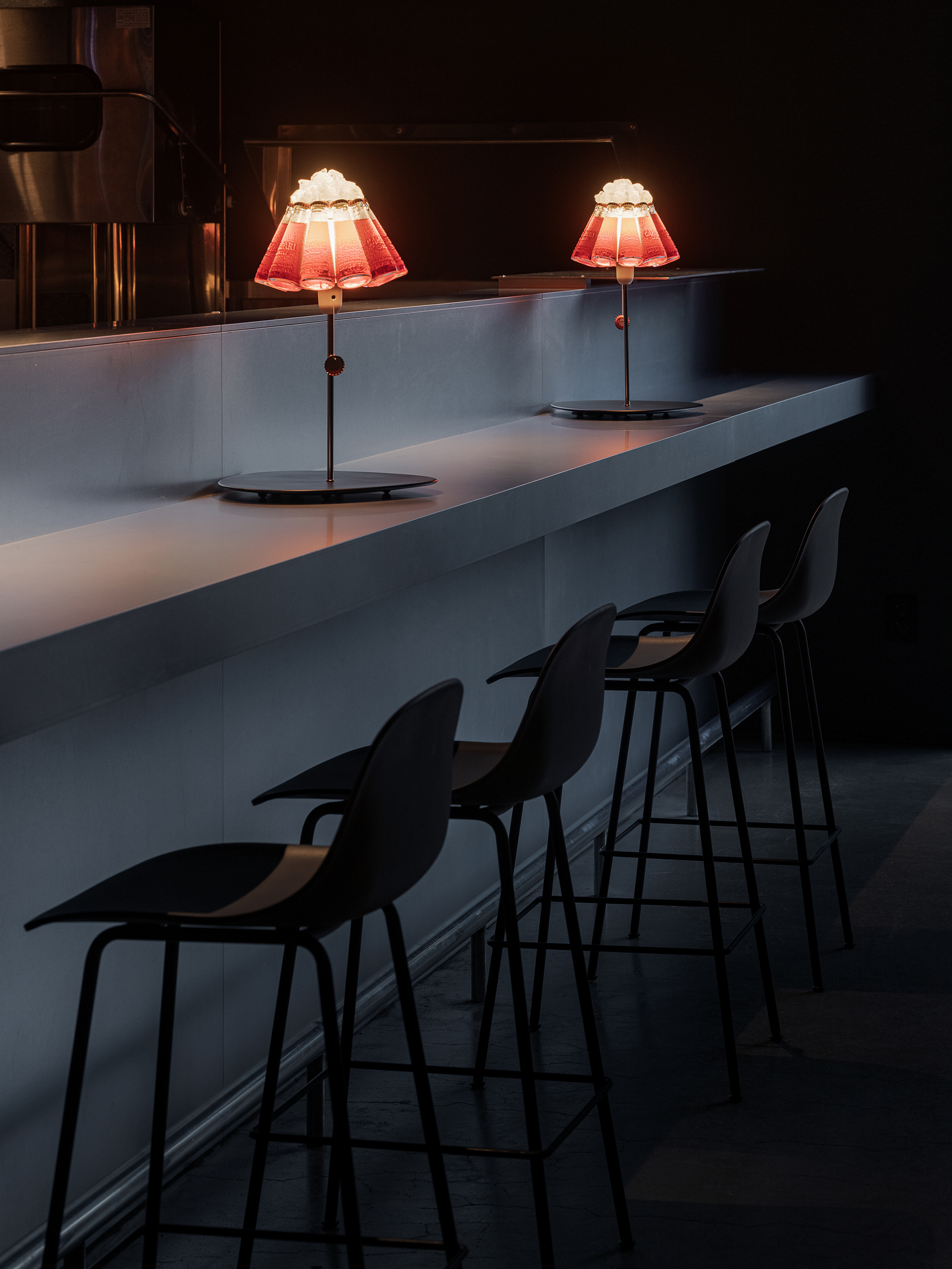 중앙의 바 테이블은 투박한 형태와 매끈한 아연 스틸의 대비를 통해 시선을 끌고, 셰프의 움직임과 조리의 리듬이 가장 또렷하게 드러나는 장면을 만든다. 조명은 공간의 분위기를 조금 비틀어주는 장치다. 자칫 무겁고 고압적으로 흐를 수 있는 재료와 톤 사이에서, 테이블 위의 잉고 마우러 캄파리 조명은 위트 있는 균형을 만든다. 붉은 병이 그대로 조명이 되는 디자인은 가볍게 장난스럽고, 어두운 공간 안에서 선명한 포인트가 된다. 덕분에 CKBG.LAB은 거칠고 강한 인상을 유지하면서도, 한쪽으로만 치우치지 않는 리듬을 갖게 된다.