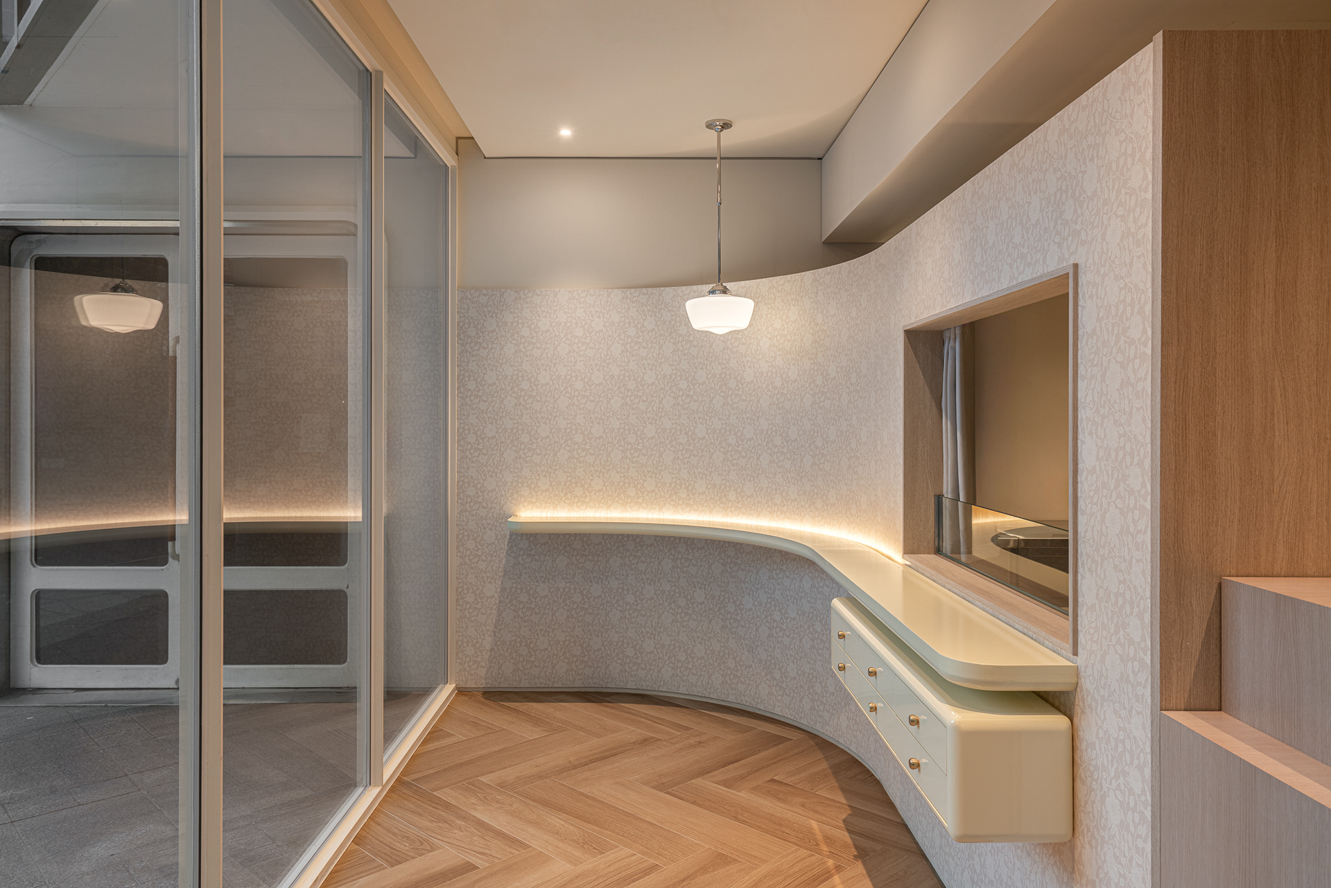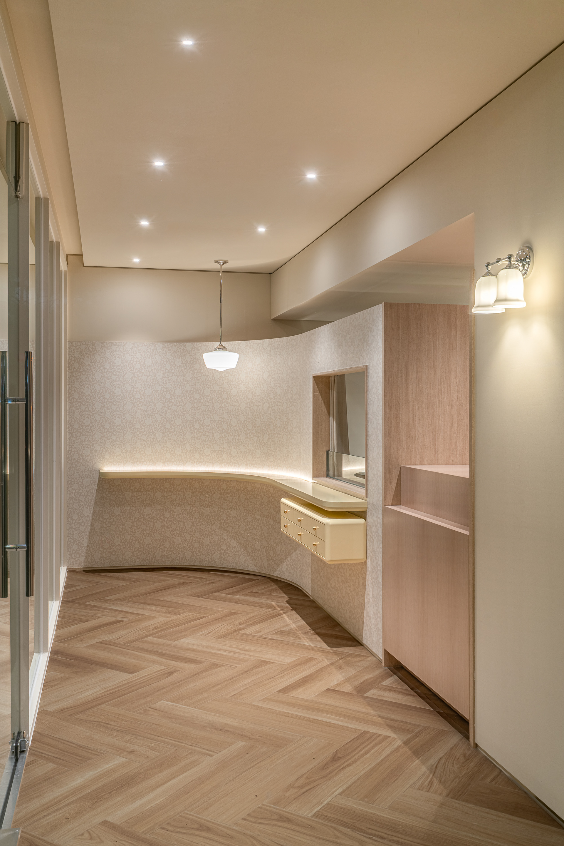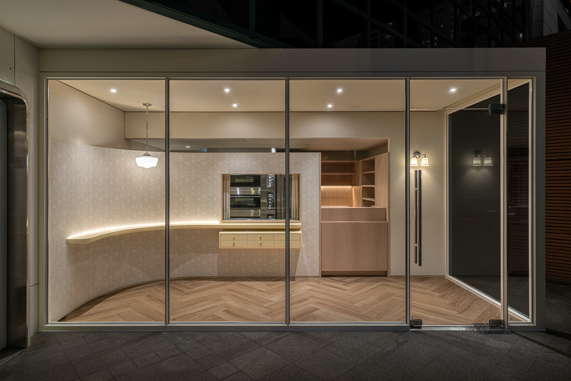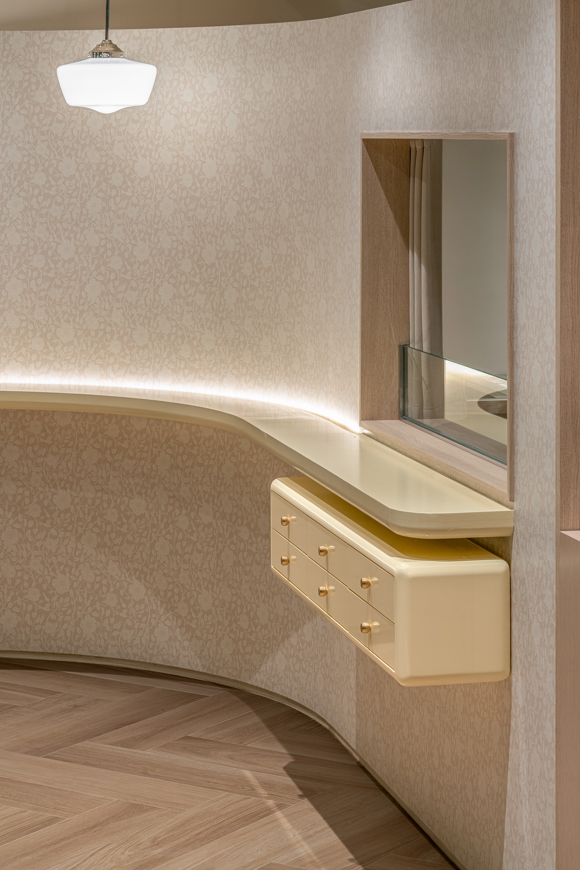 전면 유리 너머로 보이는 공간은 하나의 작은 상점이라기보다 잘 정돈된 진열장처럼 읽힌다. 곡선으로 이어지는 카운터와 벽체, 연한 크림색과 오크 톤, 은은한 패턴의 벽면은 공간을 부드럽고 조용하게 만든다. 황동 손잡이, 클래식한 조명, 헤링본 바닥 같은 디테일은 웰메이드의 감각을 더한다.