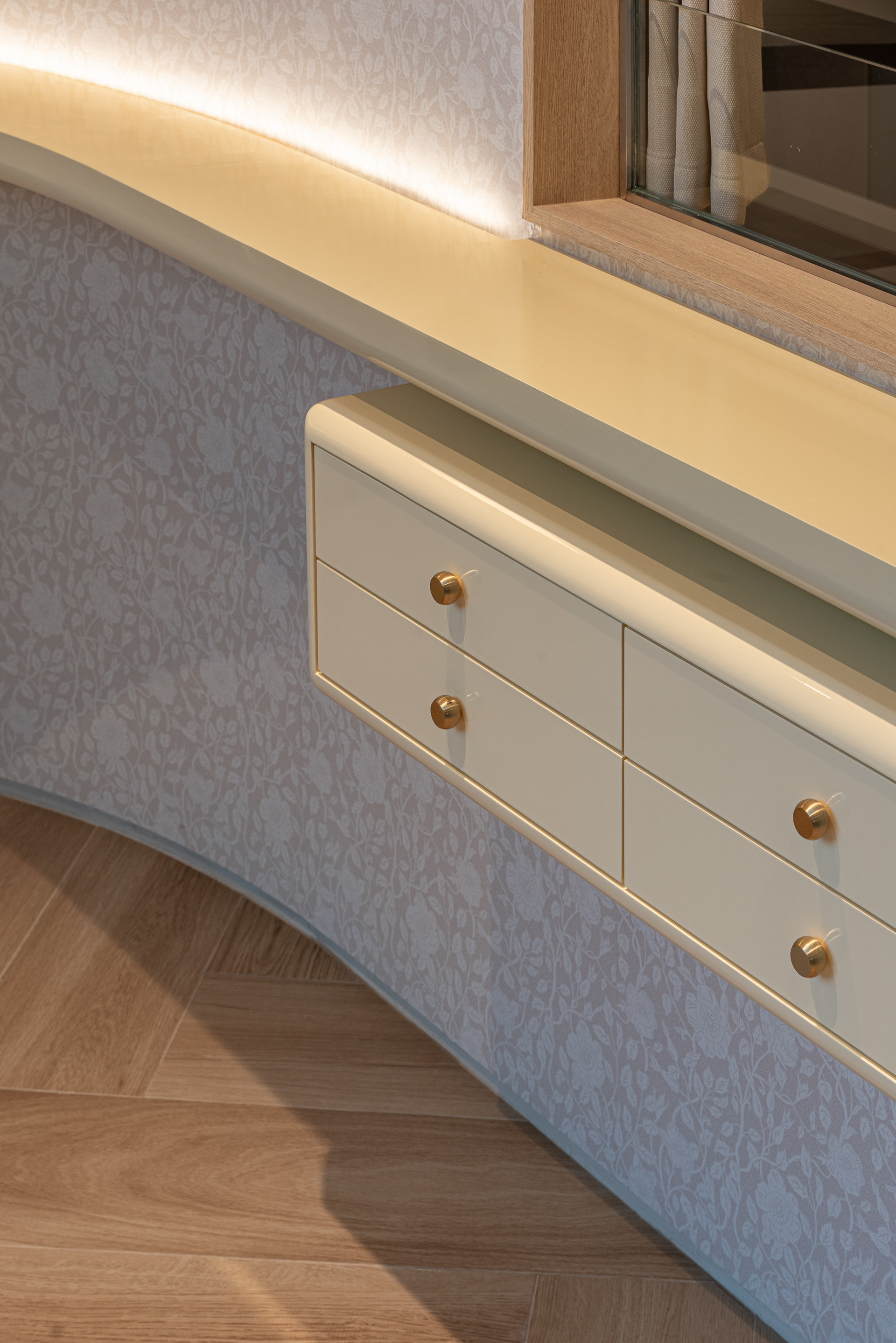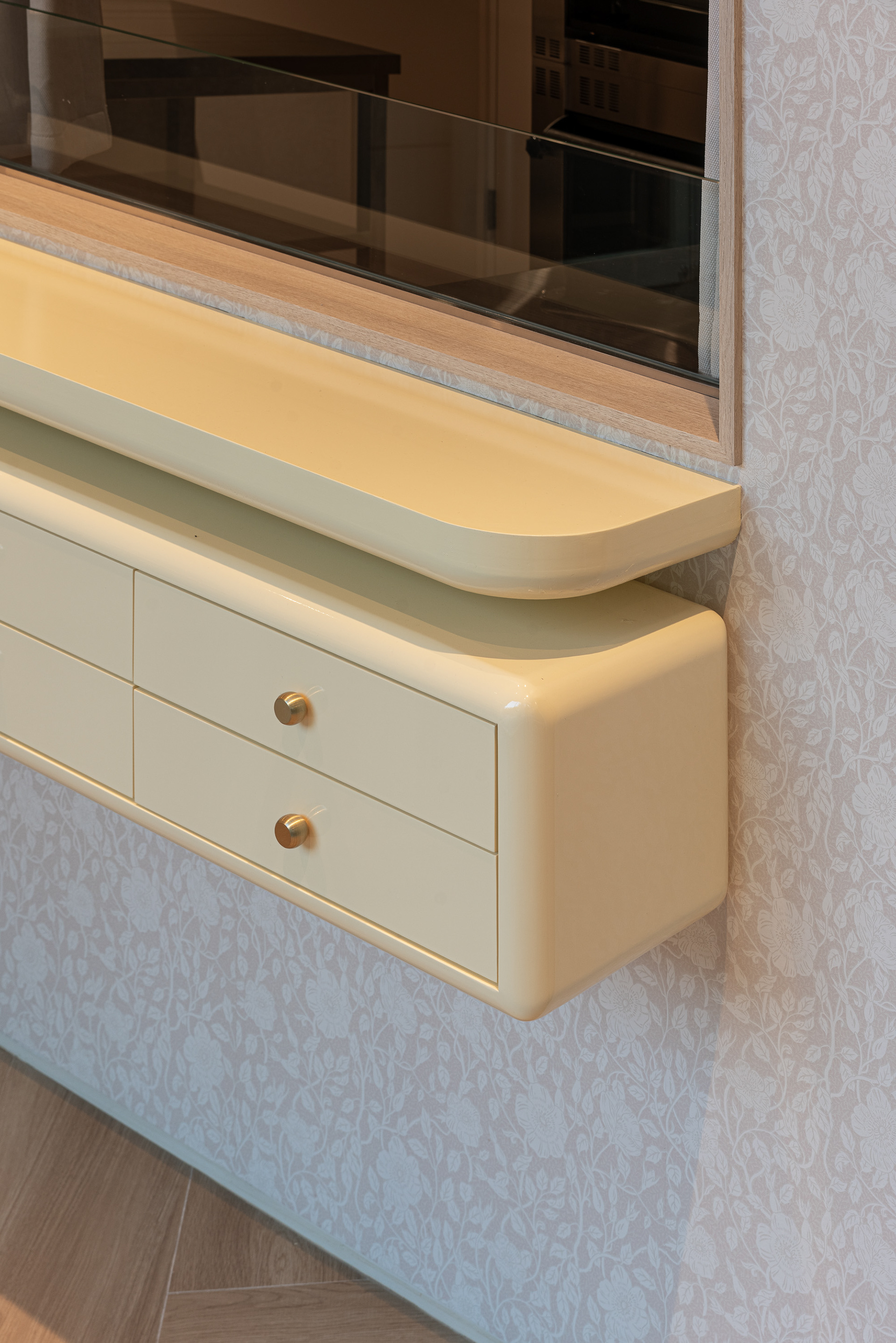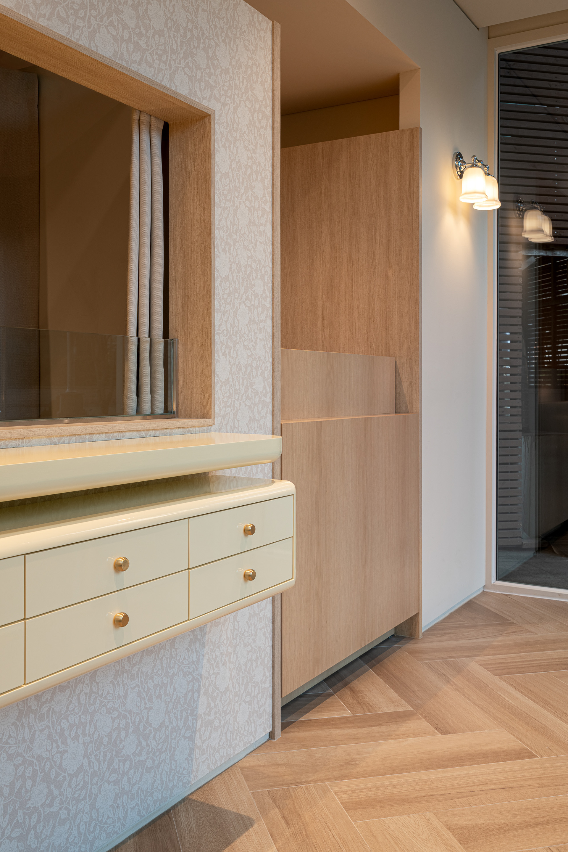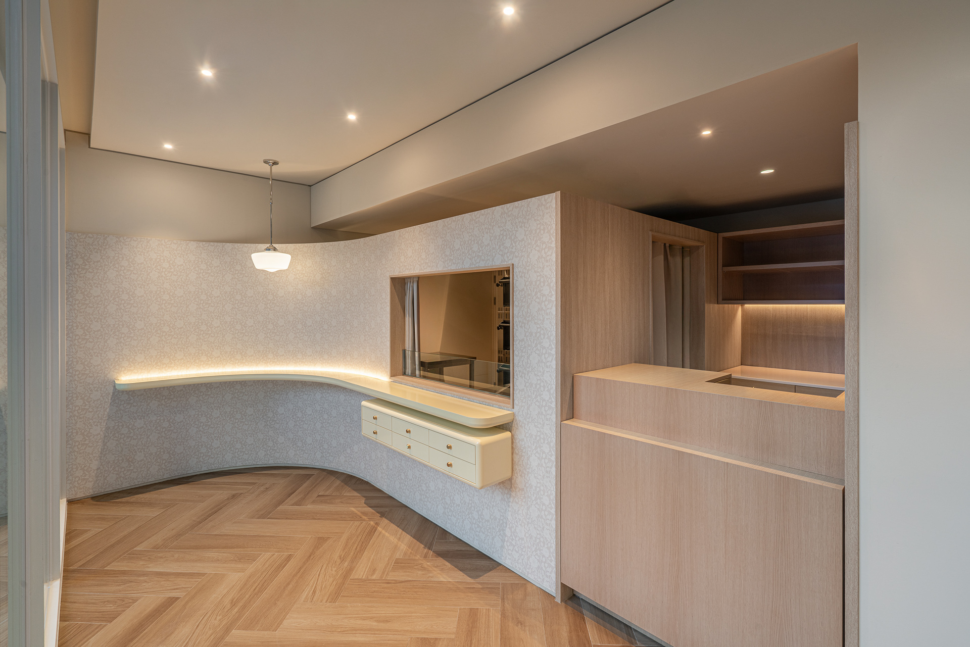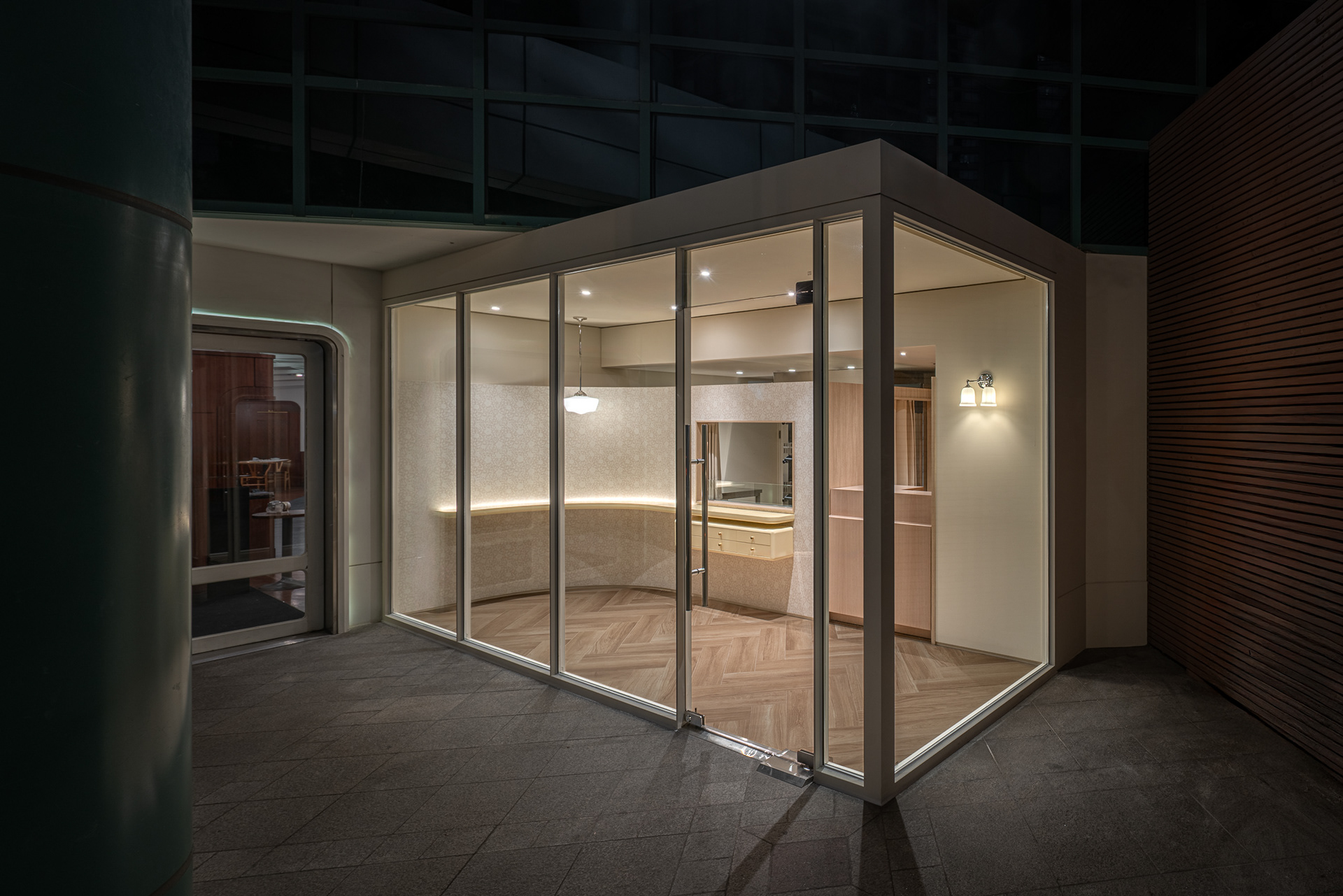 전면 유리 너머로 보이는 공간은 하나의 작은 상점이라기보다 잘 정돈된 진열장처럼 읽힌다. 곡선으로 이어지는 카운터와 벽체, 연한 크림색과 오크 톤, 은은한 패턴의 벽면은 공간을 부드럽고 조용하게 만든다. 황동 손잡이, 클래식한 조명, 헤링본 바닥 같은 디테일은 웰메이드의 감각을 더한다.