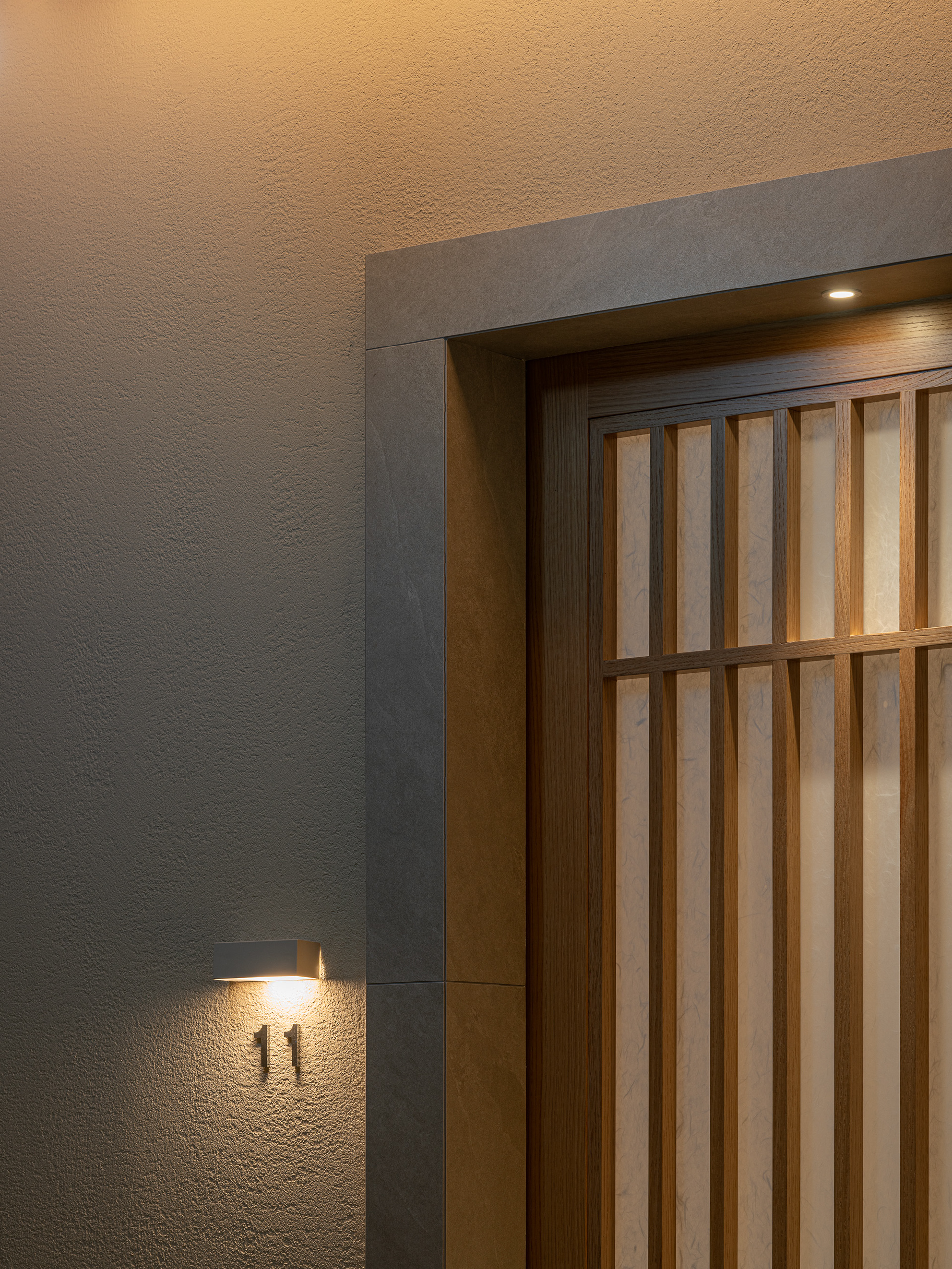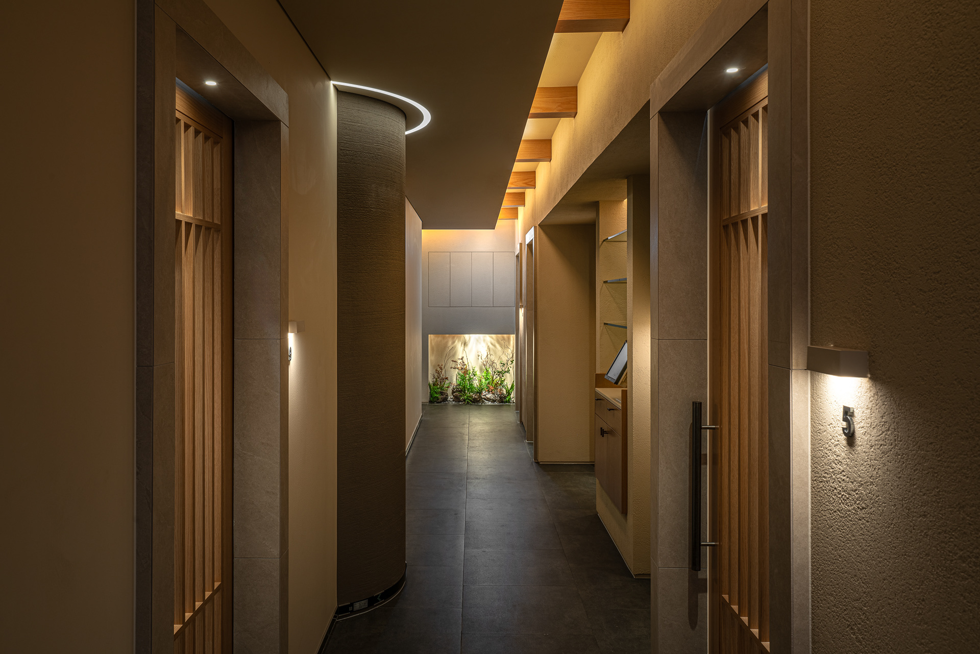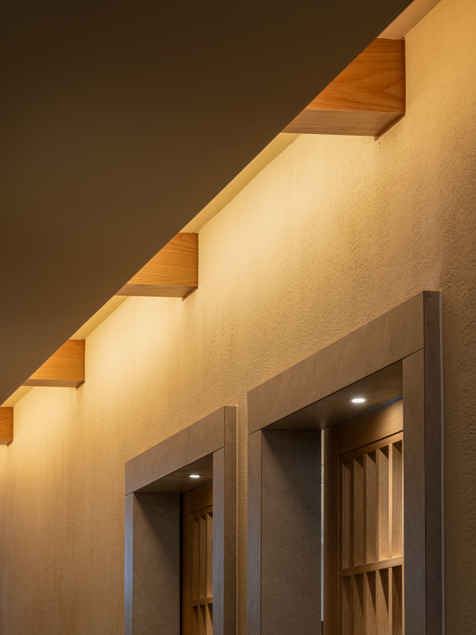복도에는 한국적인 요소를 구조와 비례의 방식으로 풀어냈다. 한옥의 서까래를 떠올리게 하는 천장 구조, 반복되는 목재의 결, 벽을 따라 흐르는 낮은 조명, 그리고 창호의 인상을 덜어낸 문 디자인이 이어진다. 전통의 이미지를 보여주기보다, 전통이 가진 질서감을 공간 전체의 리듬으로 바꾸는 쪽에 가까웠다.