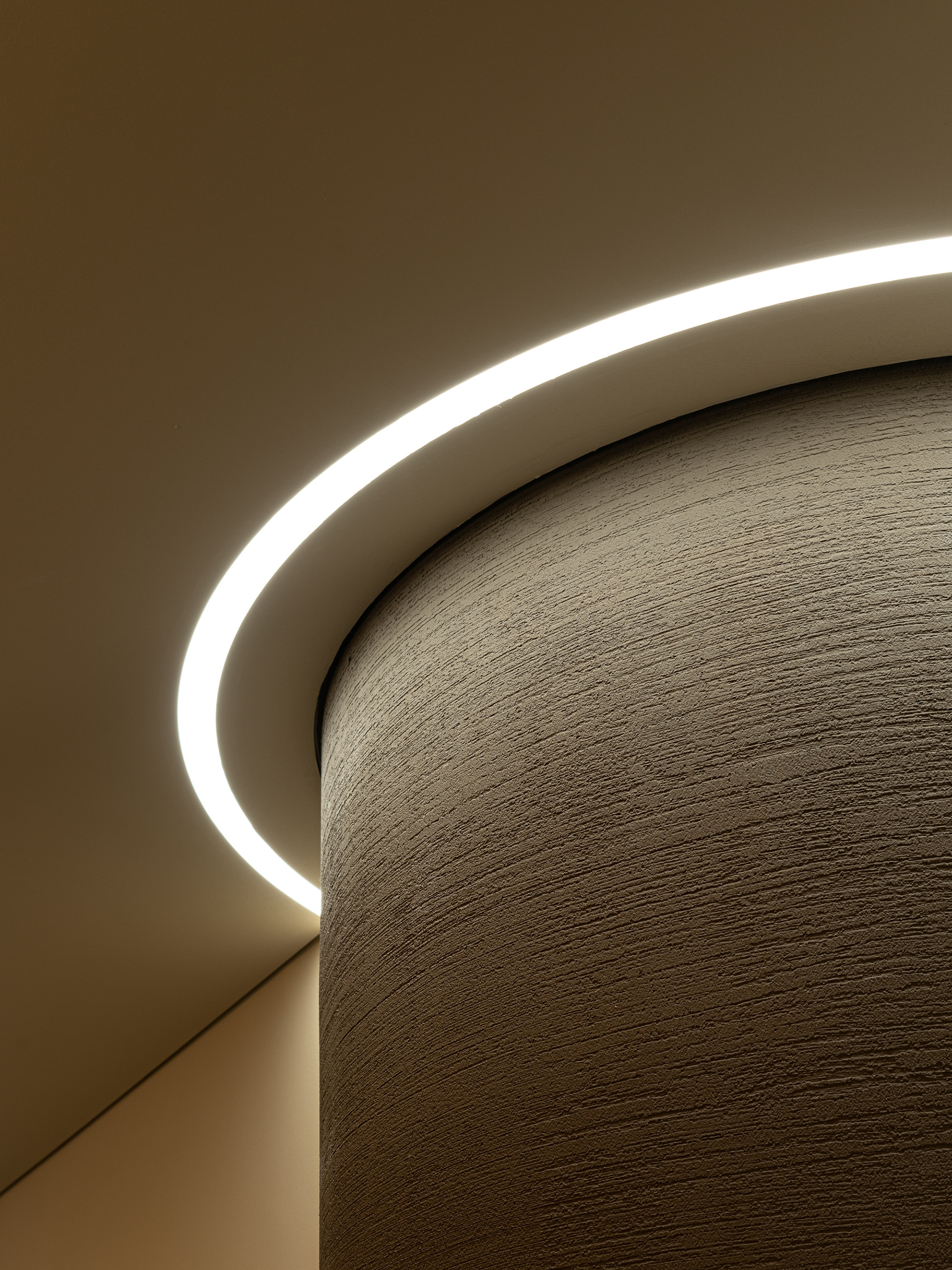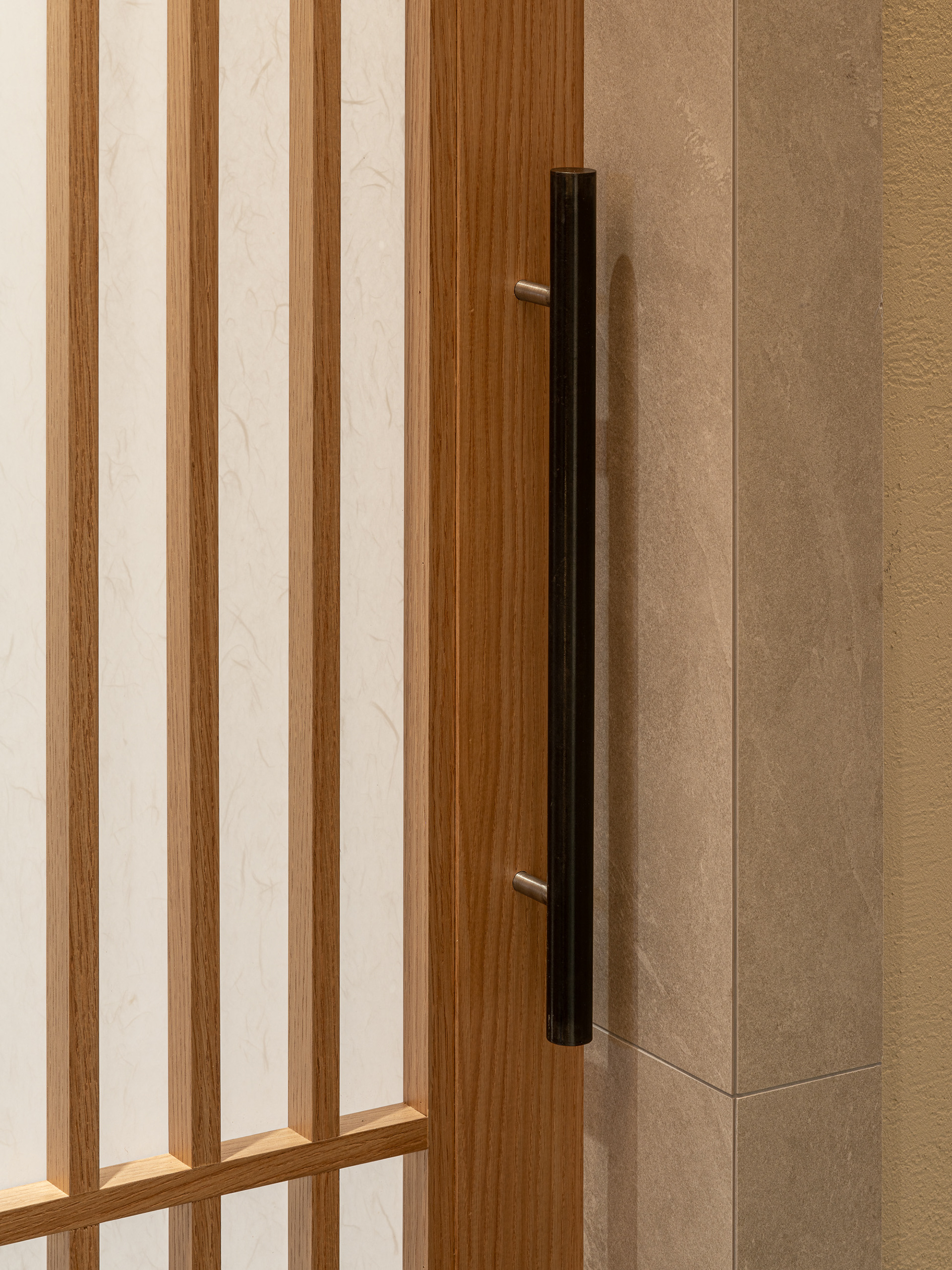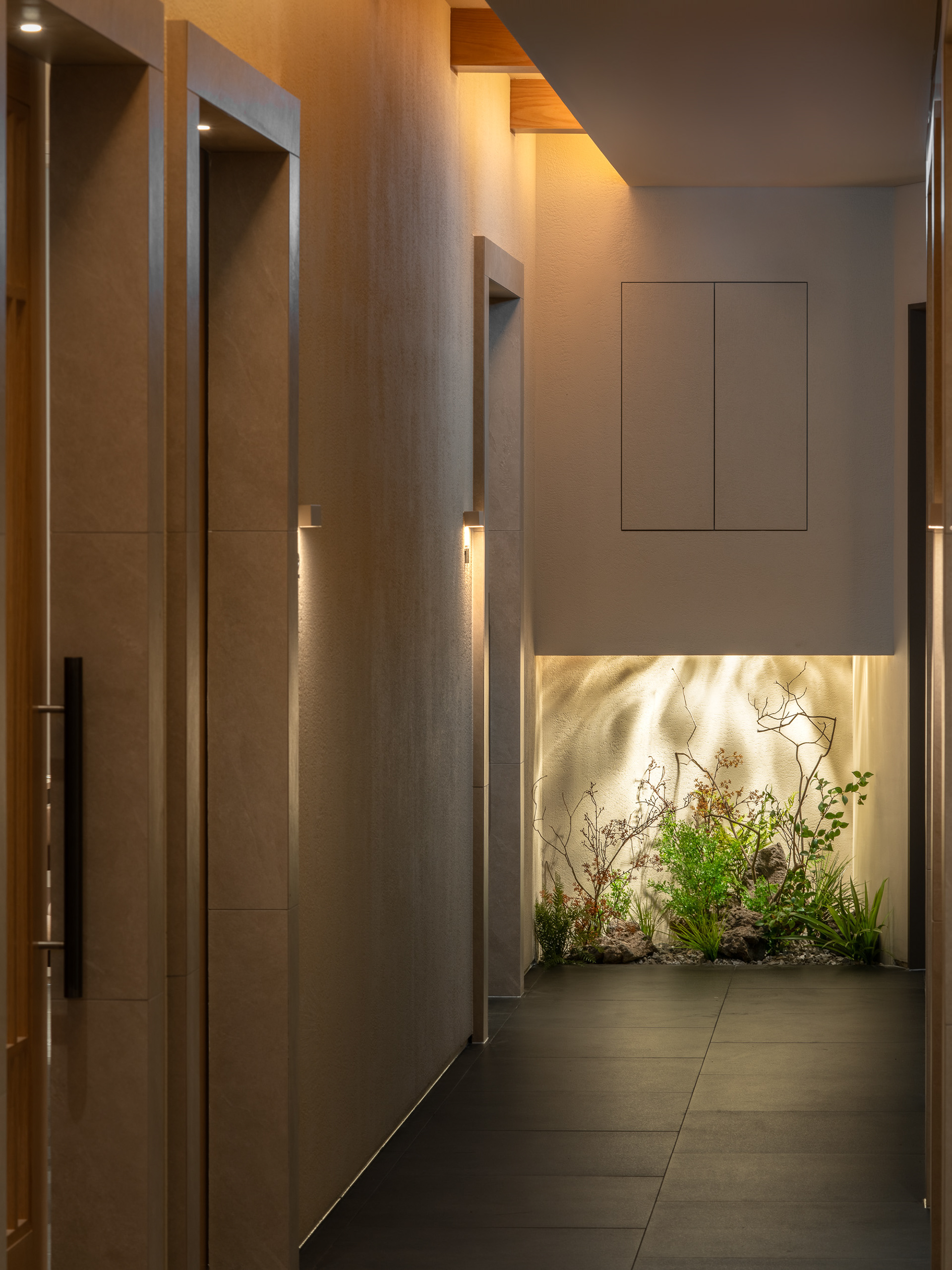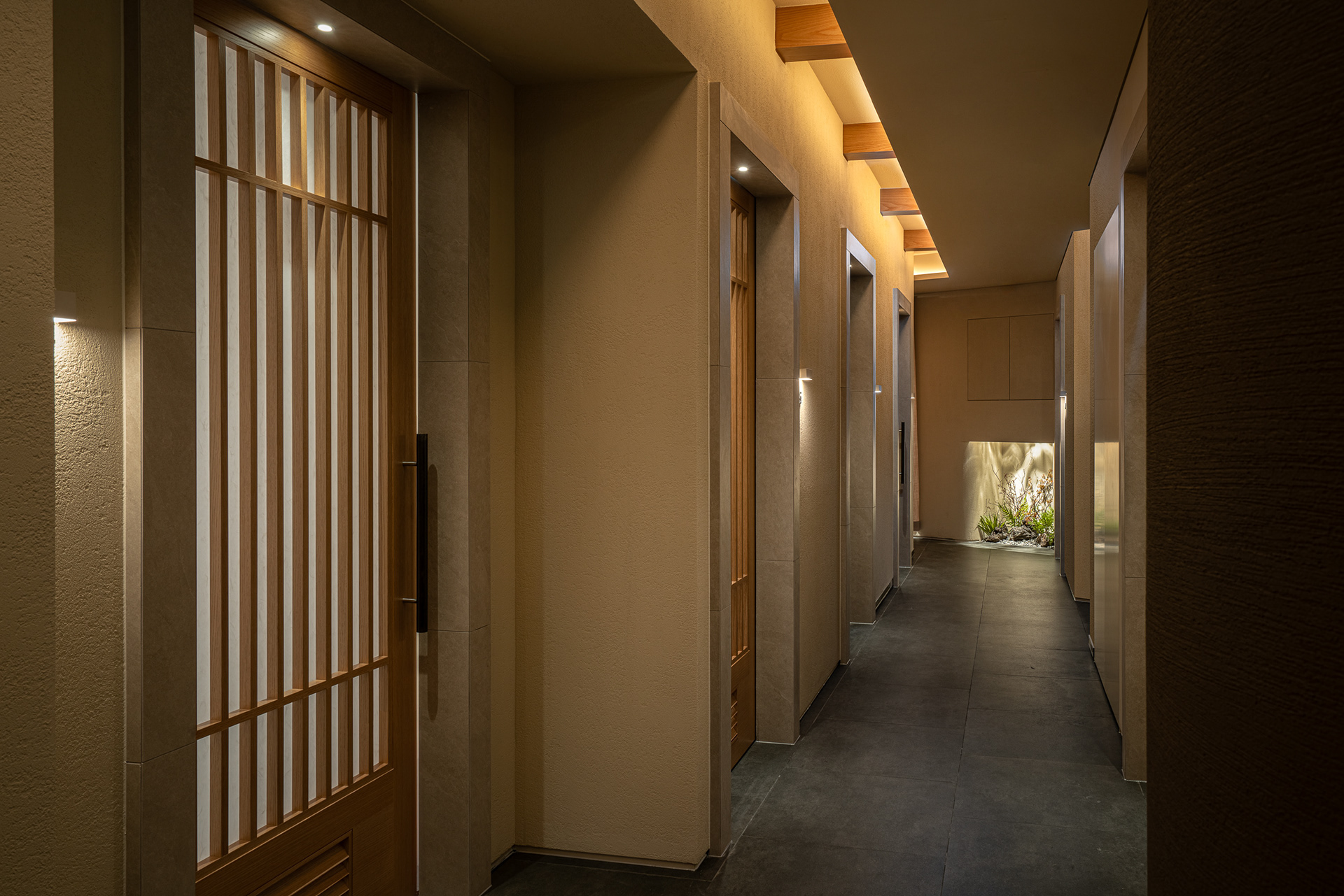복도에는 한국적인 요소를 구조와 비례의 방식으로 풀어냈다. 한옥의 서까래를 떠올리게 하는 천장 구조, 반복되는 목재의 결, 벽을 따라 흐르는 낮은 조명, 그리고 창호의 인상을 덜어낸 문 디자인이 이어진다. 전통의 이미지를 보여주기보다, 전통이 가진 질서감을 공간 전체의 리듬으로 바꾸는 쪽에 가까웠다.