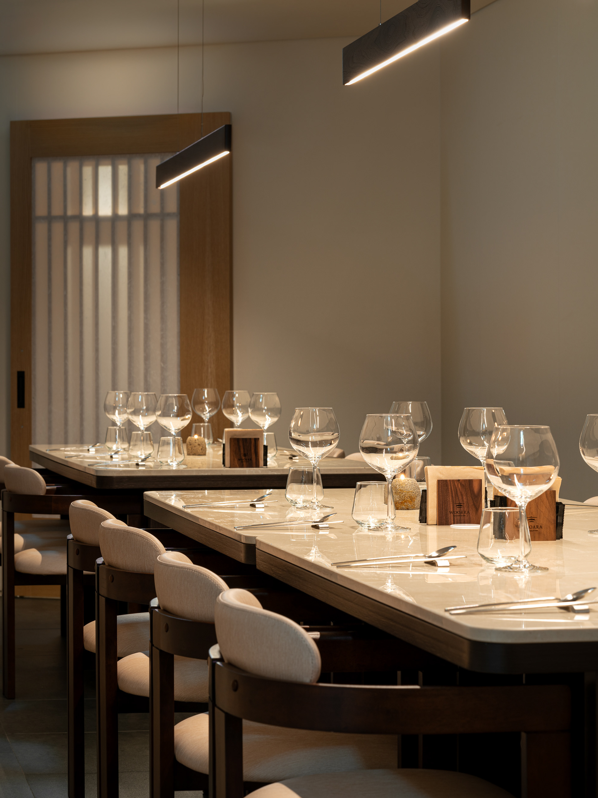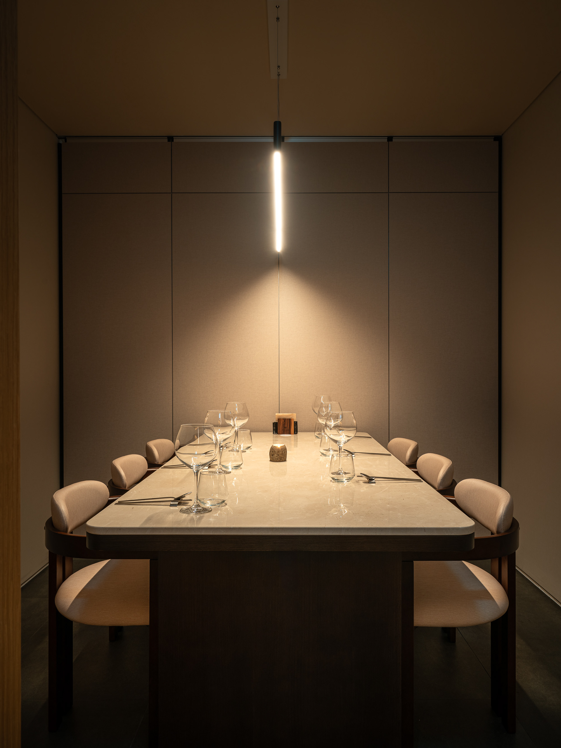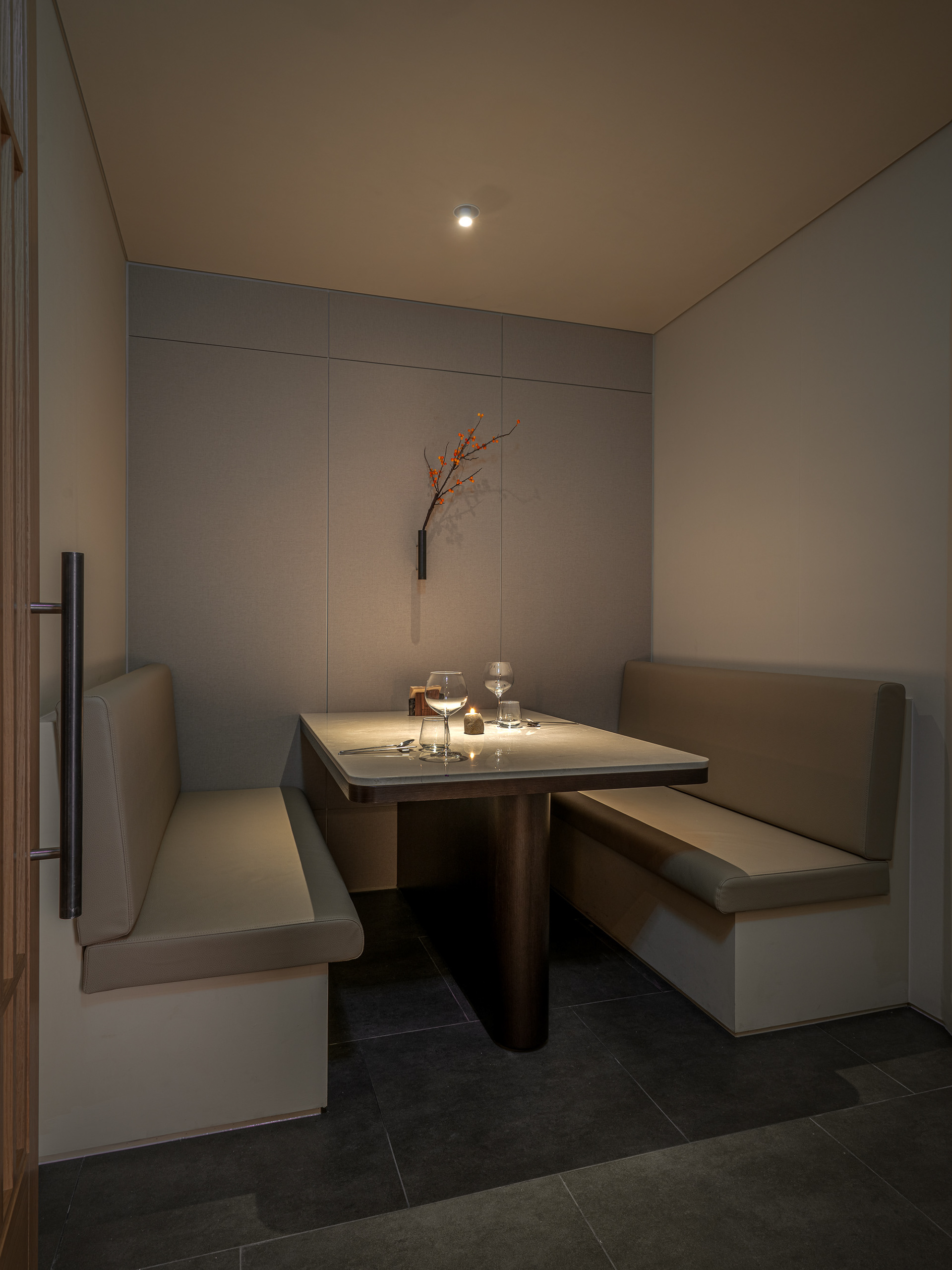 우아라는 한우와 해산물을 다루는 한식 파인다이닝이다. 공간은 그 두 재료의 성격처럼, 육지의 무게와 바다의 흐름을 함께 담는 방향으로 설계했다. 한국적인 분위기를 직접 재현하기보다, 전통이 가진 여백과 질서, 절제된 밀도를 현대적인 방식으로 정리하는 데 집중했다.