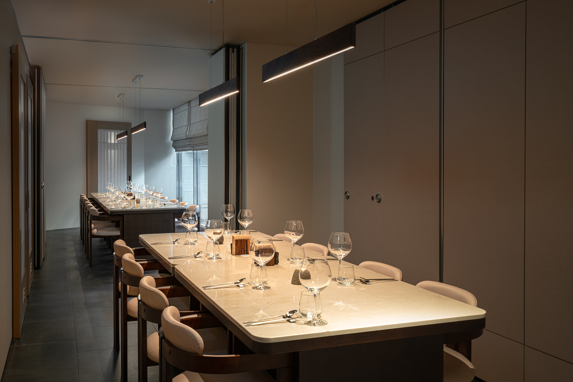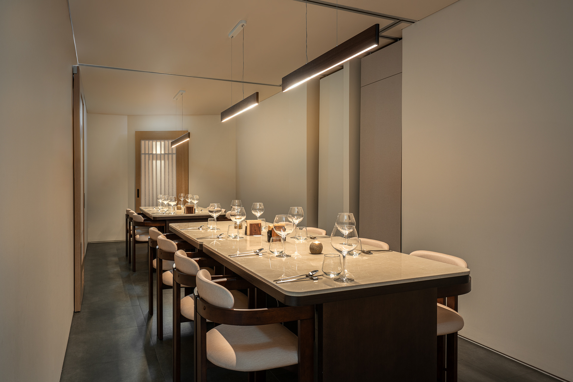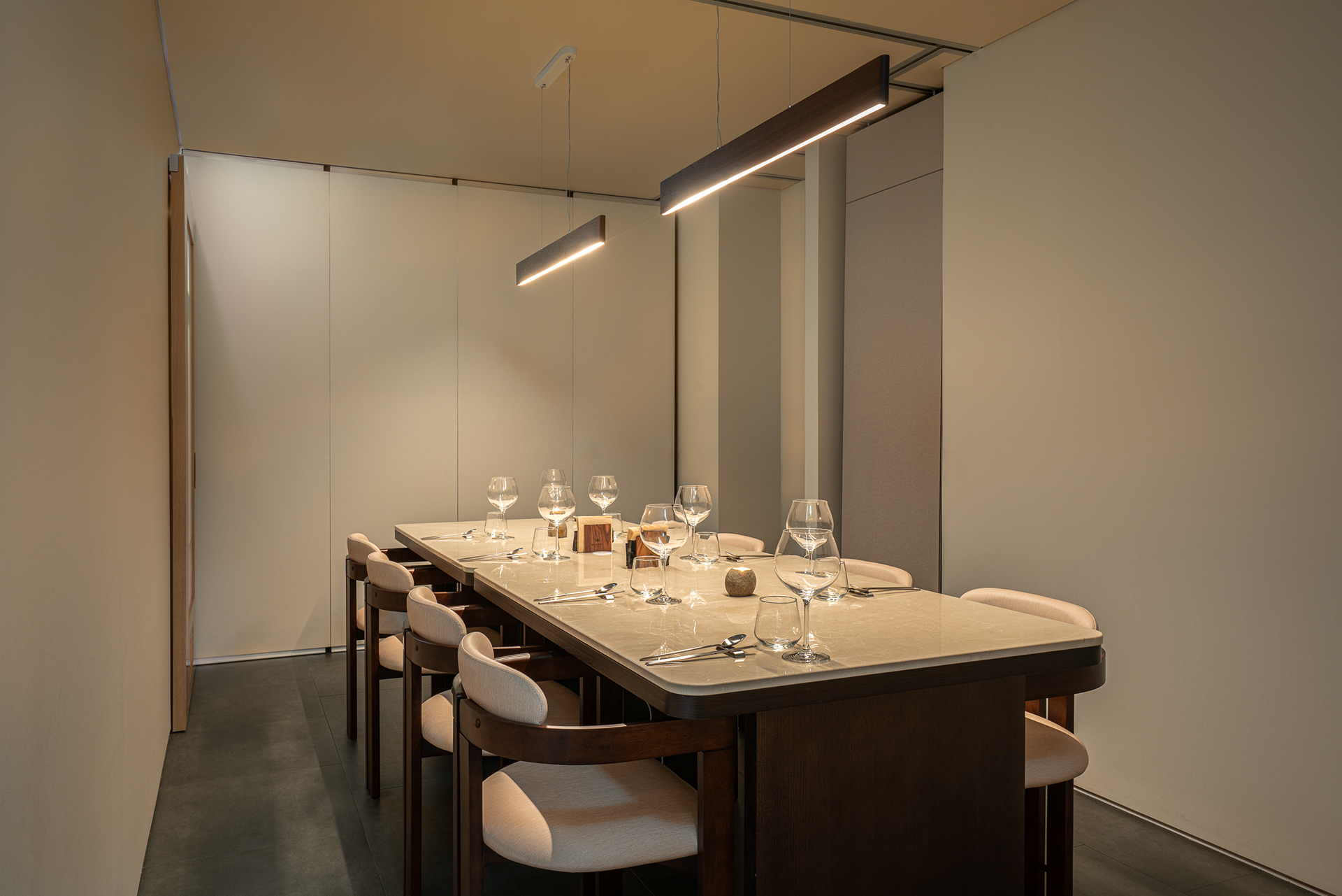 우아라는 한우와 해산물을 다루는 한식 파인다이닝이다. 공간은 그 두 재료의 성격처럼, 육지의 무게와 바다의 흐름을 함께 담는 방향으로 설계했다. 한국적인 분위기를 직접 재현하기보다, 전통이 가진 여백과 질서, 절제된 밀도를 현대적인 방식으로 정리하는 데 집중했다.