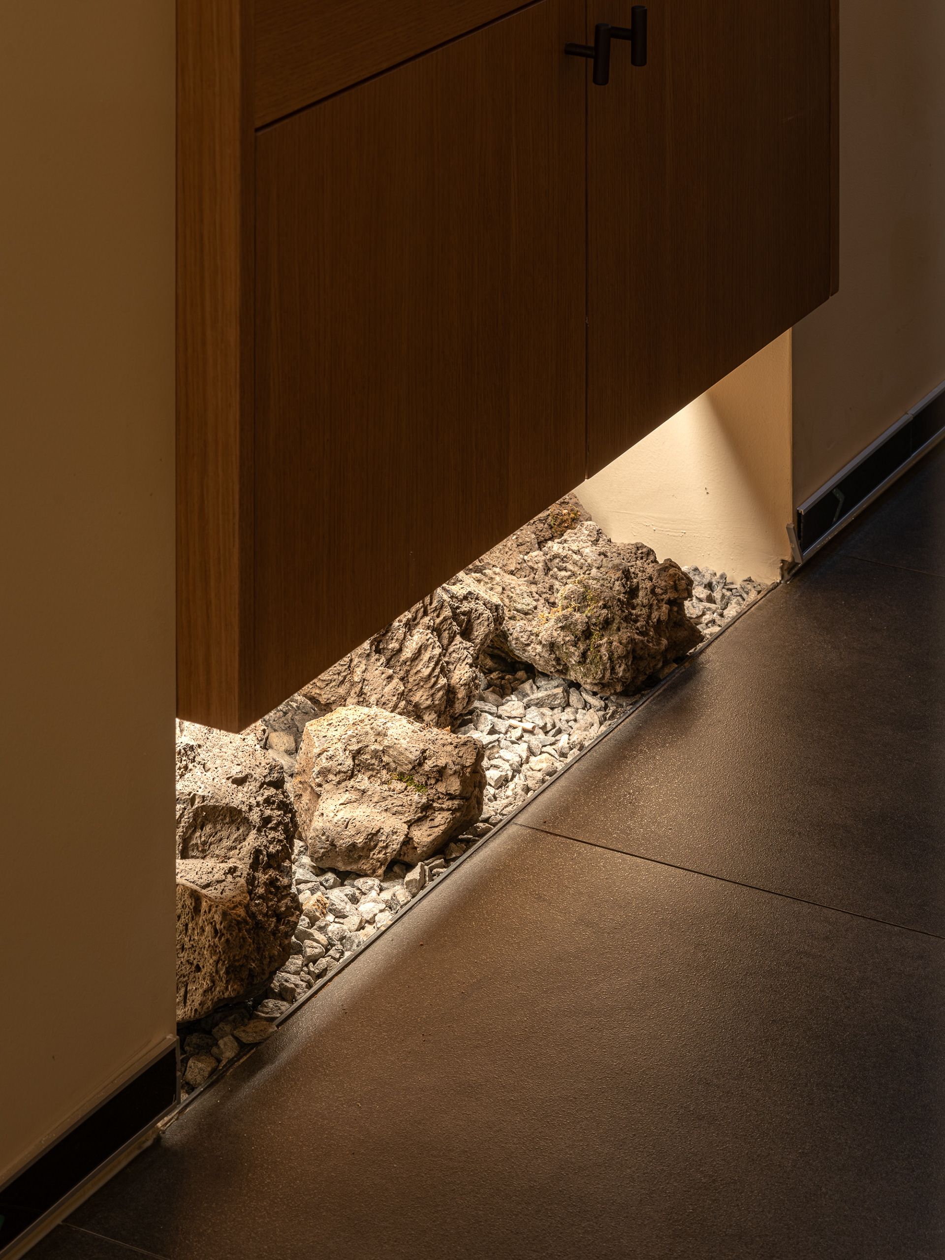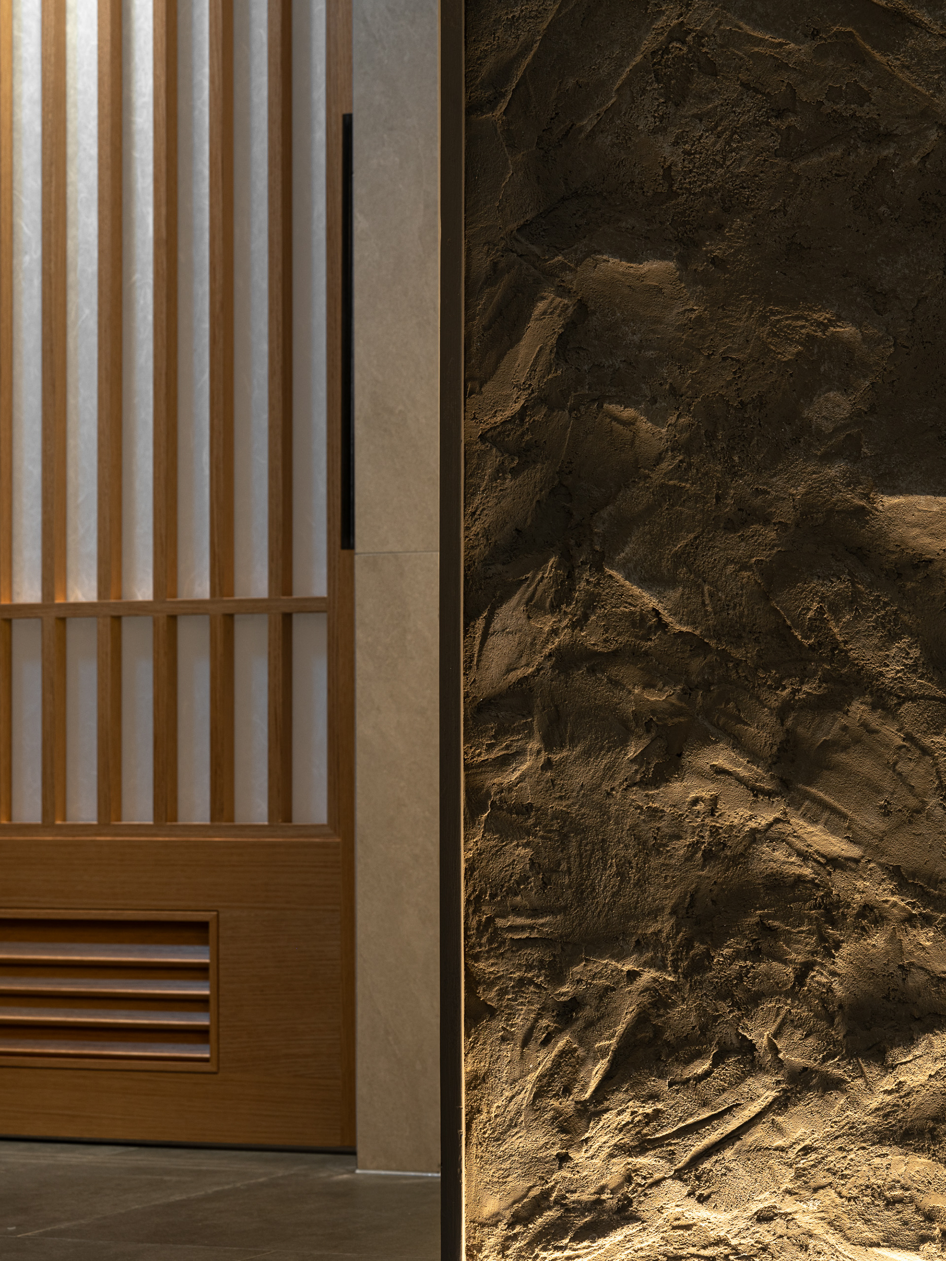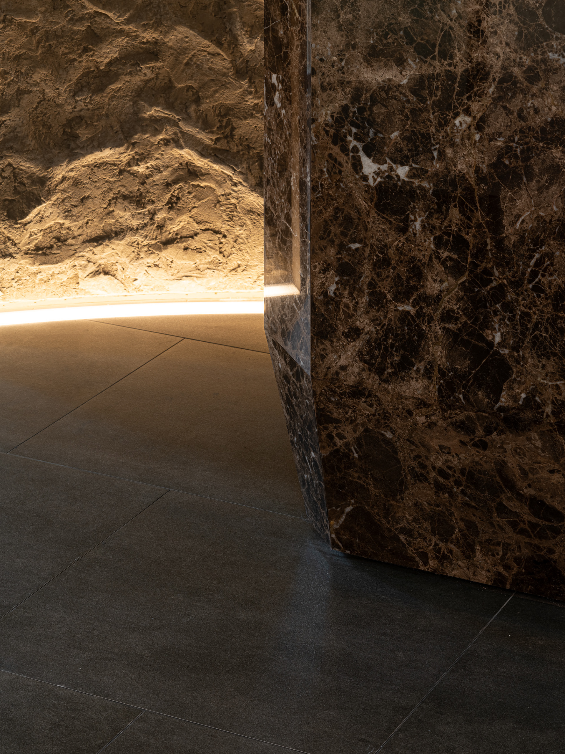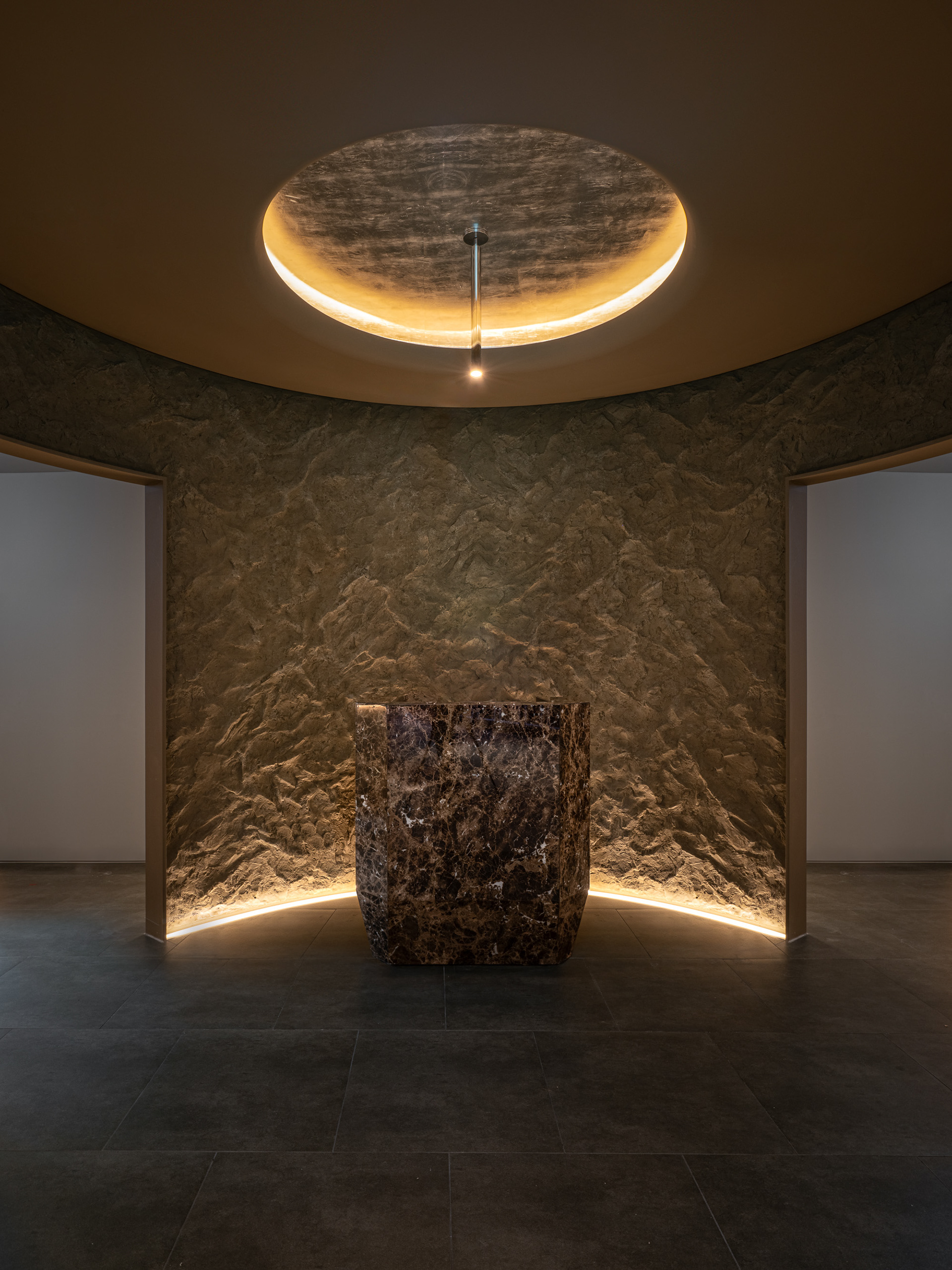로비는 밝고 친절한 공간이 아니라, 감각을 한 번 가라앉히는 장면에 가깝다. 어두운 톤과 묵직한 재료, 자연석을 닮은 거친 벽면, 짙은 대리석 리셉션 데스크를 통해 공간의 중심을 낮고 단단하게 잡았다. 조명은 앞에 나서기보다 재료의 질감과 깊이를 정리하는 역할에 머문다.