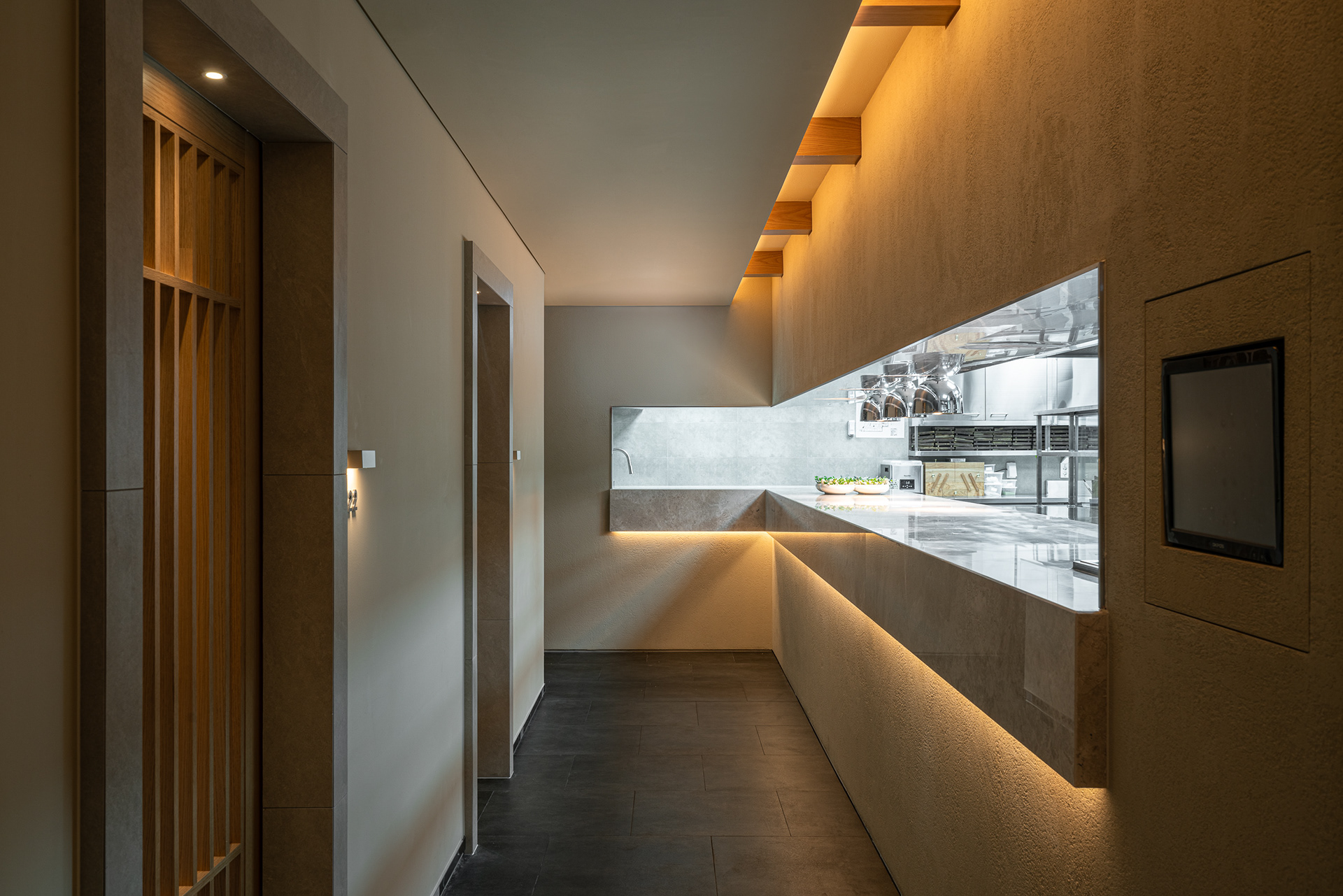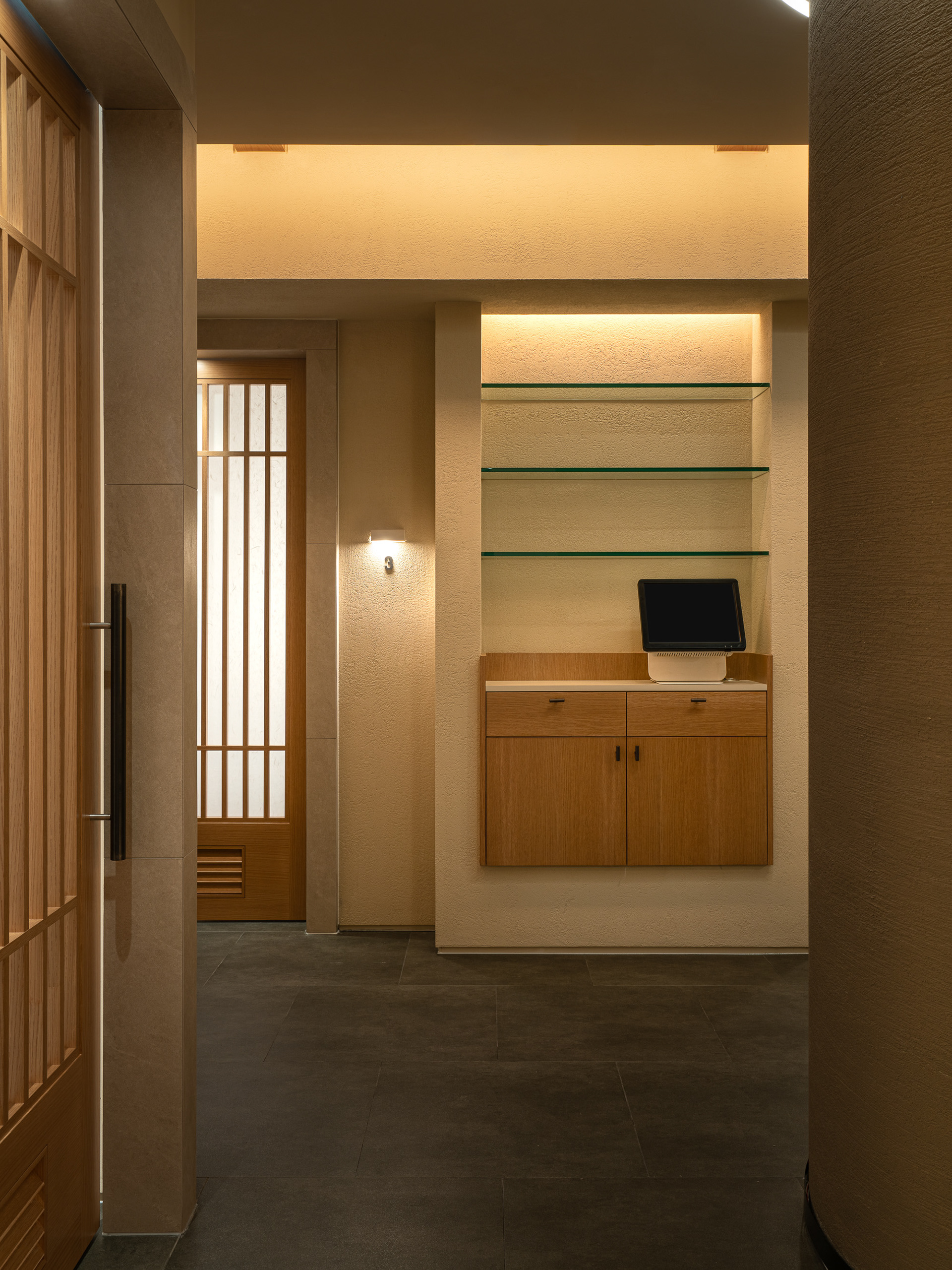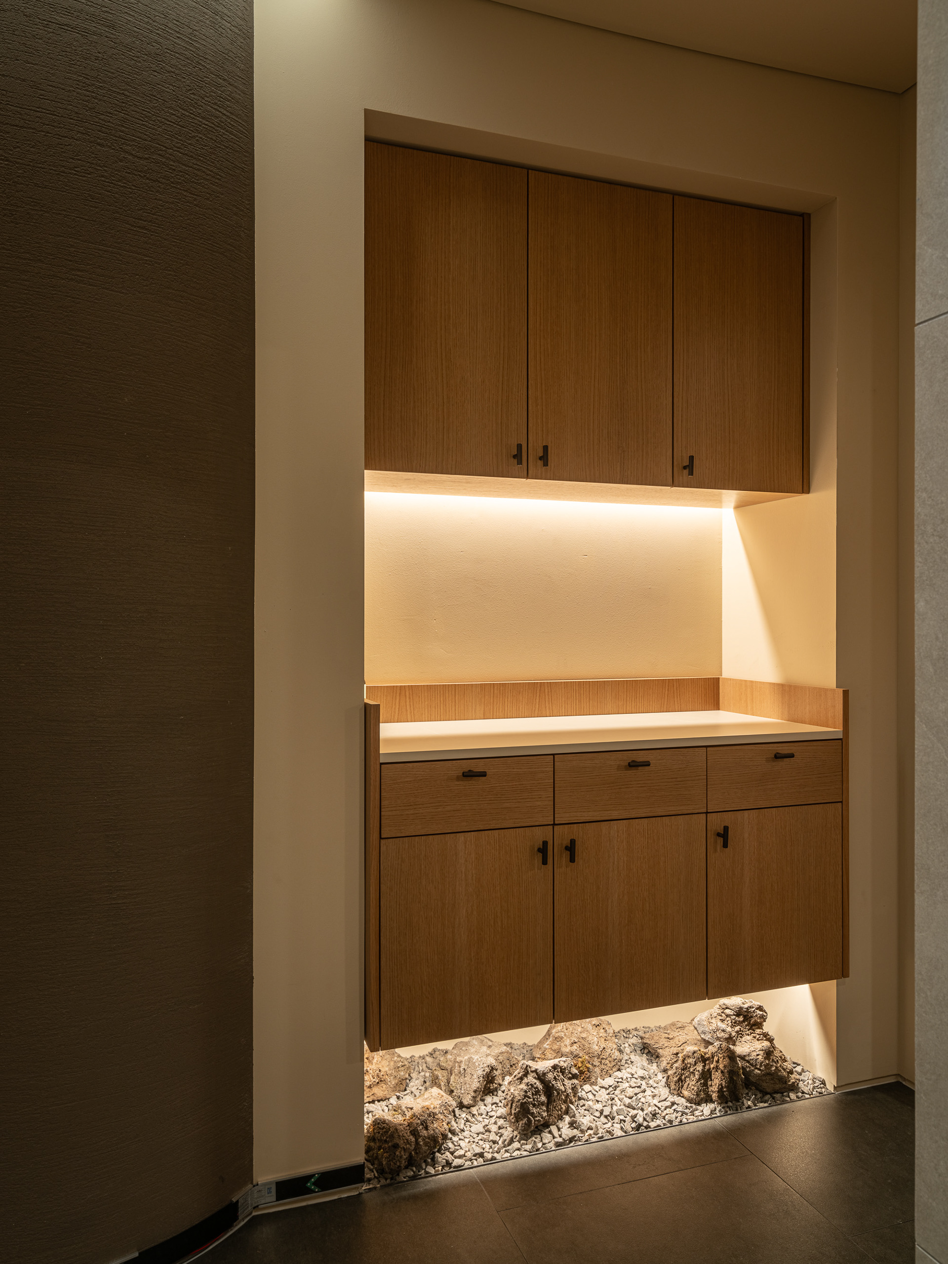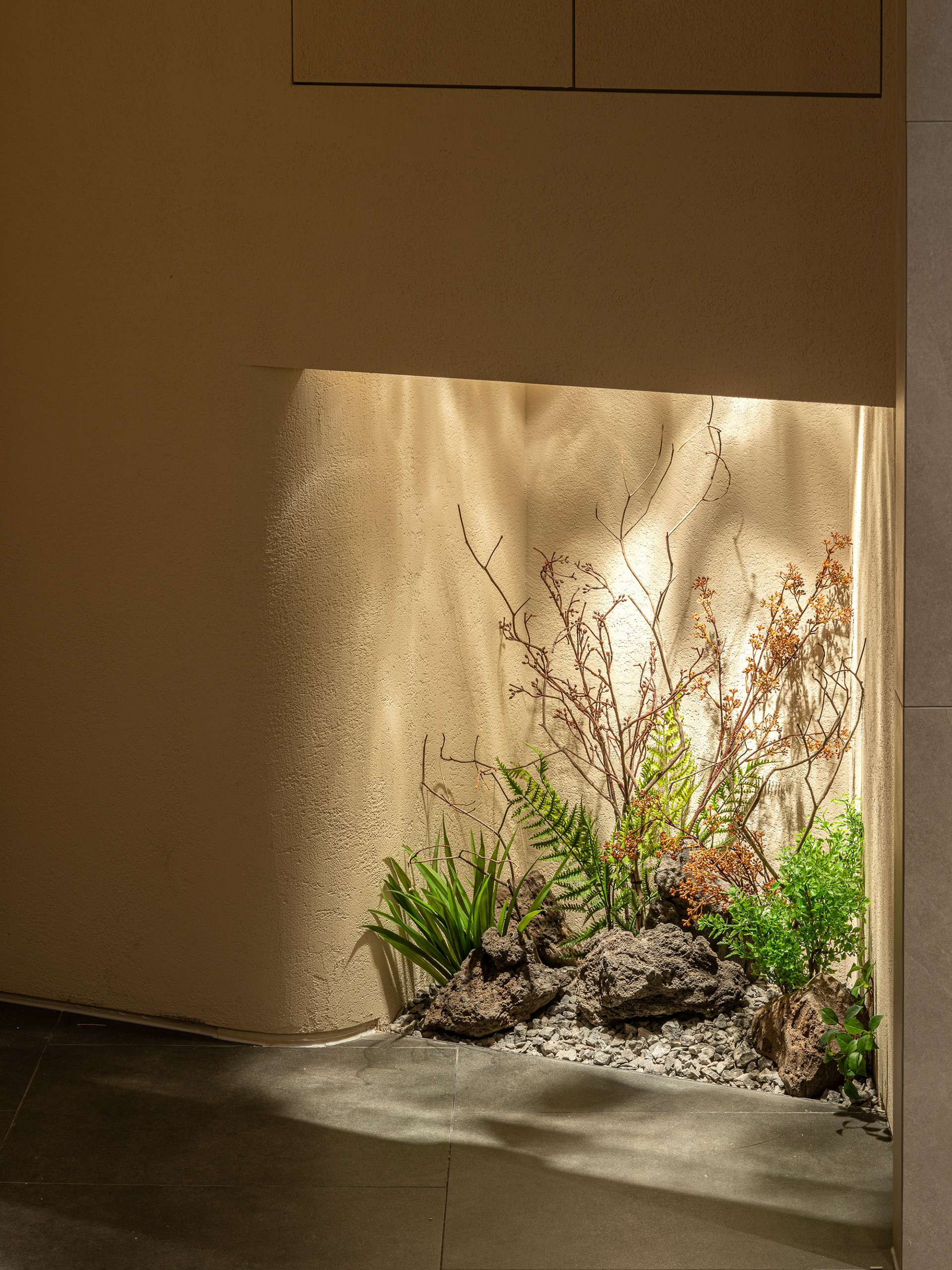 로비는 밝고 친절한 공간이 아니라, 감각을 한 번 가라앉히는 장면에 가깝다. 어두운 톤과 묵직한 재료, 자연석을 닮은 거친 벽면, 짙은 대리석 리셉션 데스크를 통해 공간의 중심을 낮고 단단하게 잡았다. 조명은 앞에 나서기보다 재료의 질감과 깊이를 정리하는 역할에 머문다.
